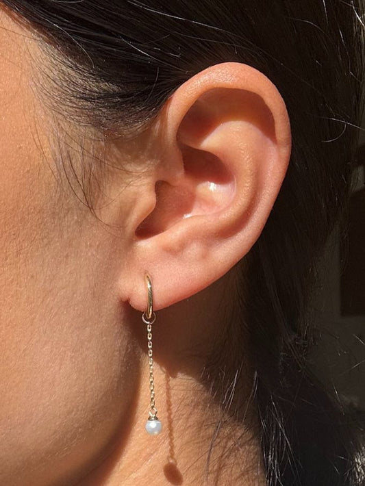 Huggie Earrings With Small FWP Chain Drop in 9 Carat Yellow Gold