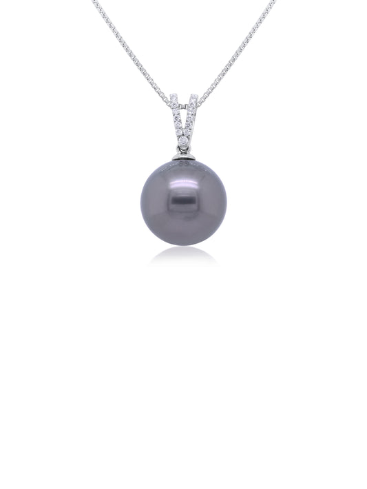 Tahitian Pearl & Diamond Set Pendant, 9K White Gold, 13mm.
