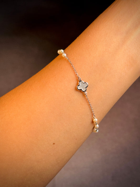 Pearl & Mother Of Pearl Set Clover Bracelet in 9 Carat White Gold