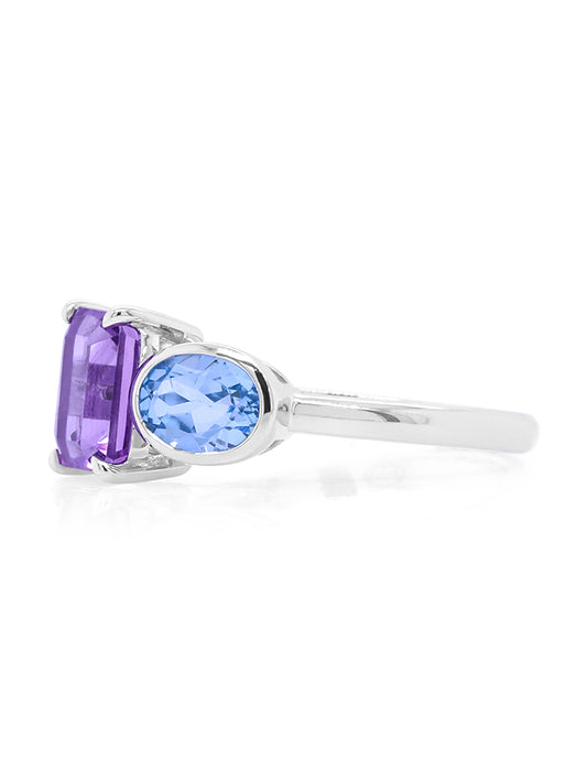 Emerald Cut Amethyst & Blue Topaz Dress Ring in 9 Carat White Gold