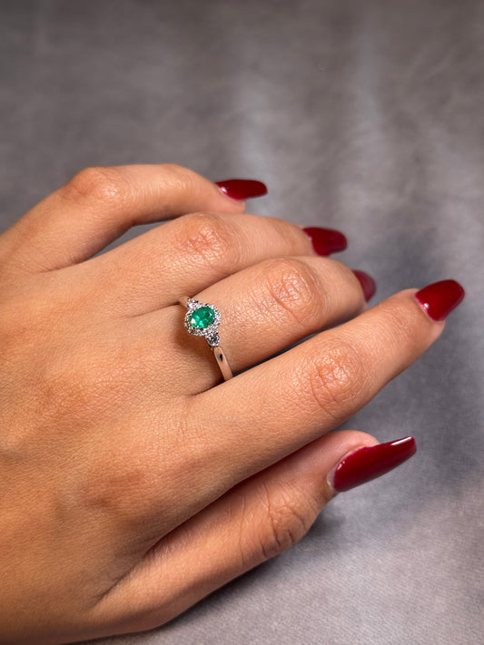 Emerald & Diamond Cluster Ring in 9 Carat White Gold.