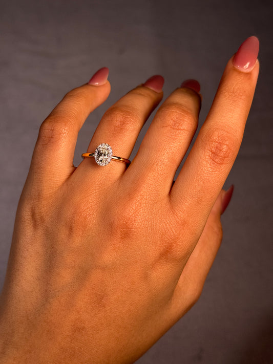 Lab Grown 0.63 Carat Oval Diamond Halo 18 Carat Yellow Gold Ring