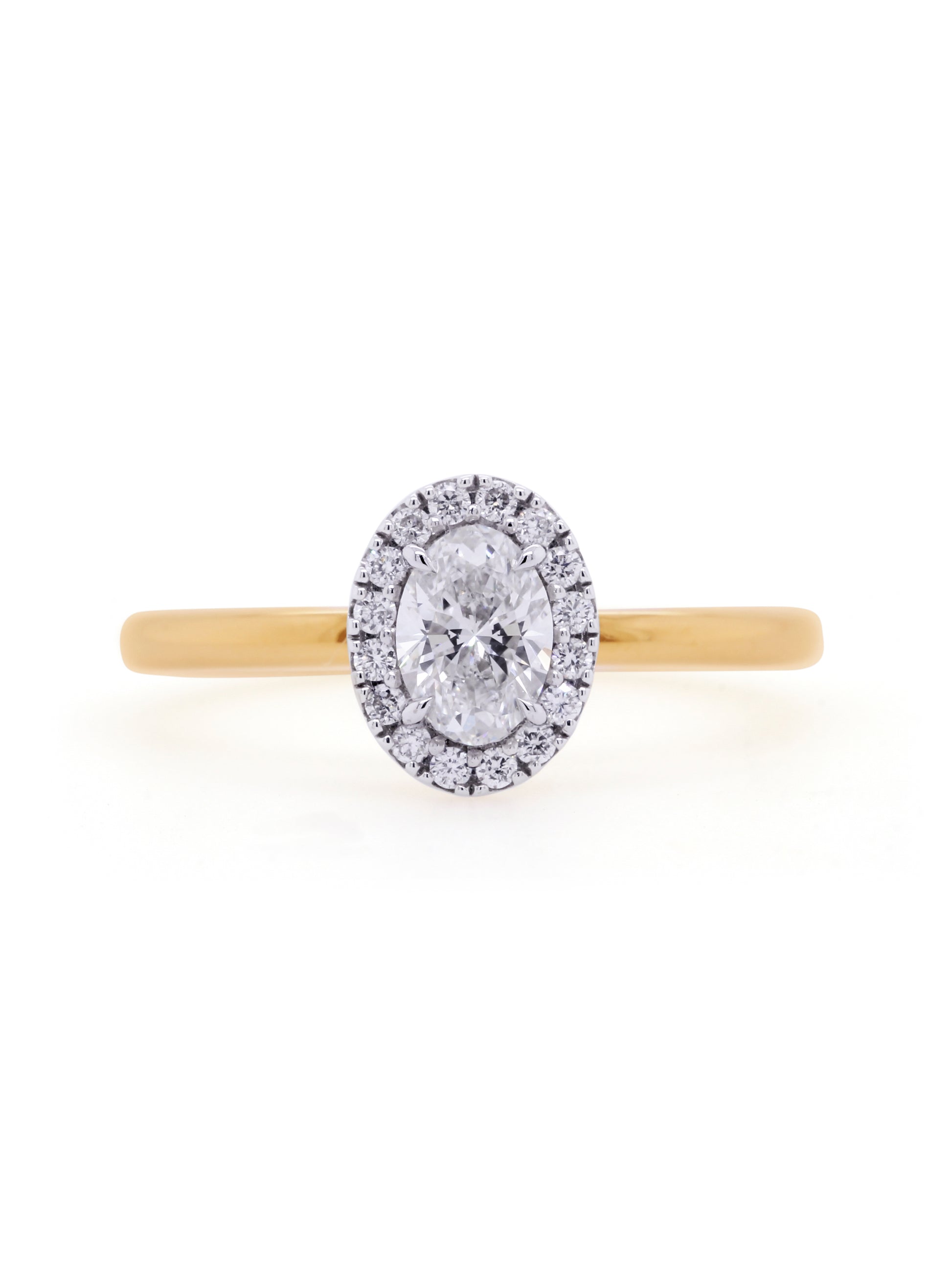 Exude timeless elegance with this Lab Grown Diamond Halo Ring. The captivating oval-cut lab-grown diamond is 0.50 Carats and surrounded by a dazzling halo cluster of smaller diamonds totaling 0.13 carats. Set in luxurious 18 carat yellow gold, this ring combines sophistication with ethical sourcing, making it a perfect symbol of love and commitment.