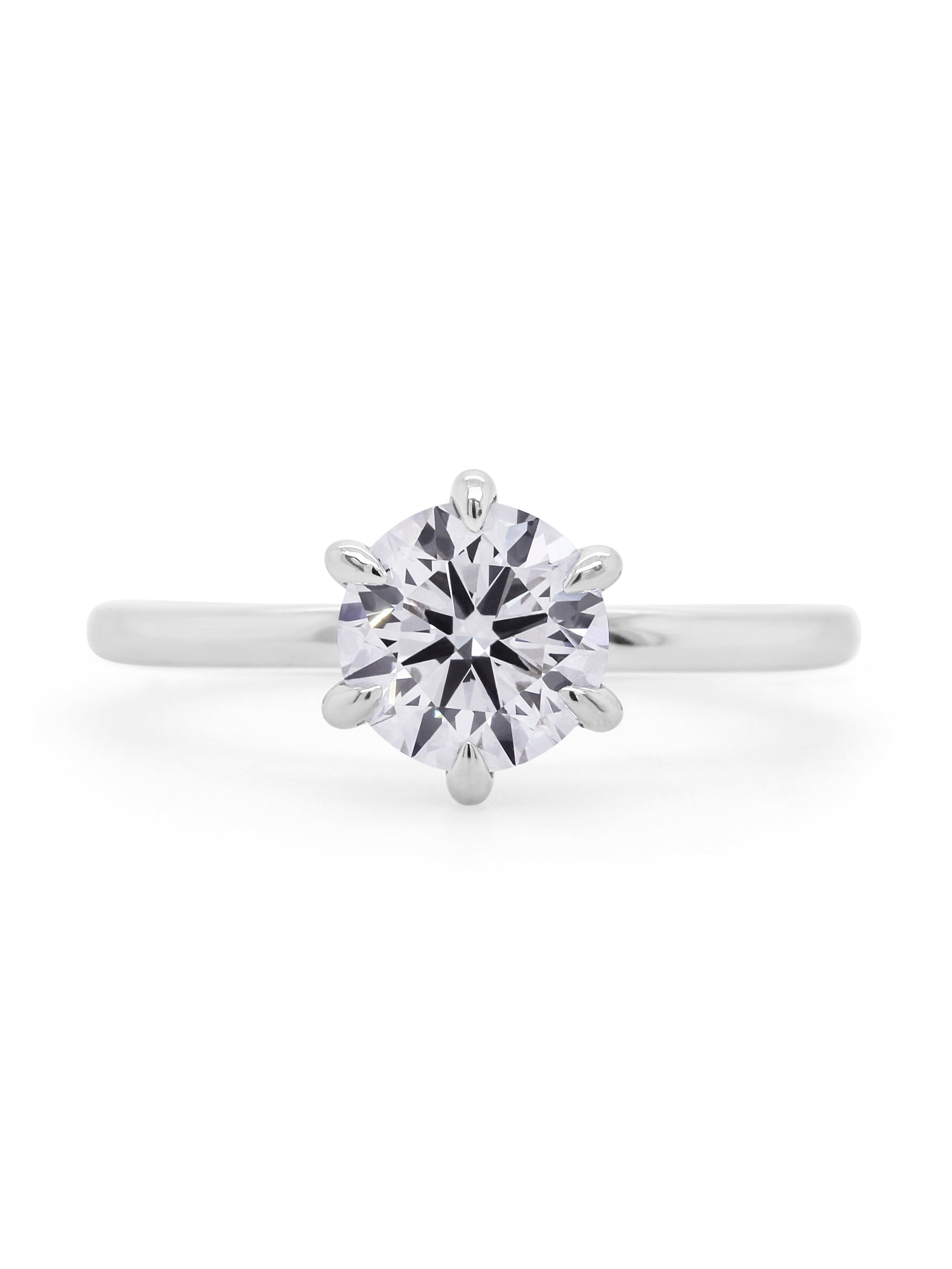 A classic solitaire ring in 18 carat white gold featuring a lab grown 1.26 carat round brilliant cut diamond of E colour and SI1 clarity, IGI certified for quality and authenticity.
