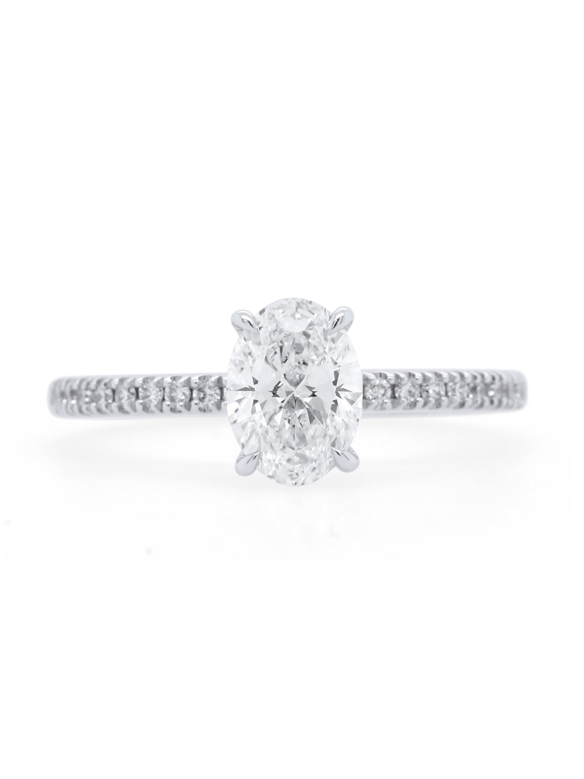 This elegant lab grown oval diamond ring features a stunning 1.01 carat centre stone set in 18 carat white goldan exquisite blend of timeless design and modern sustainability.