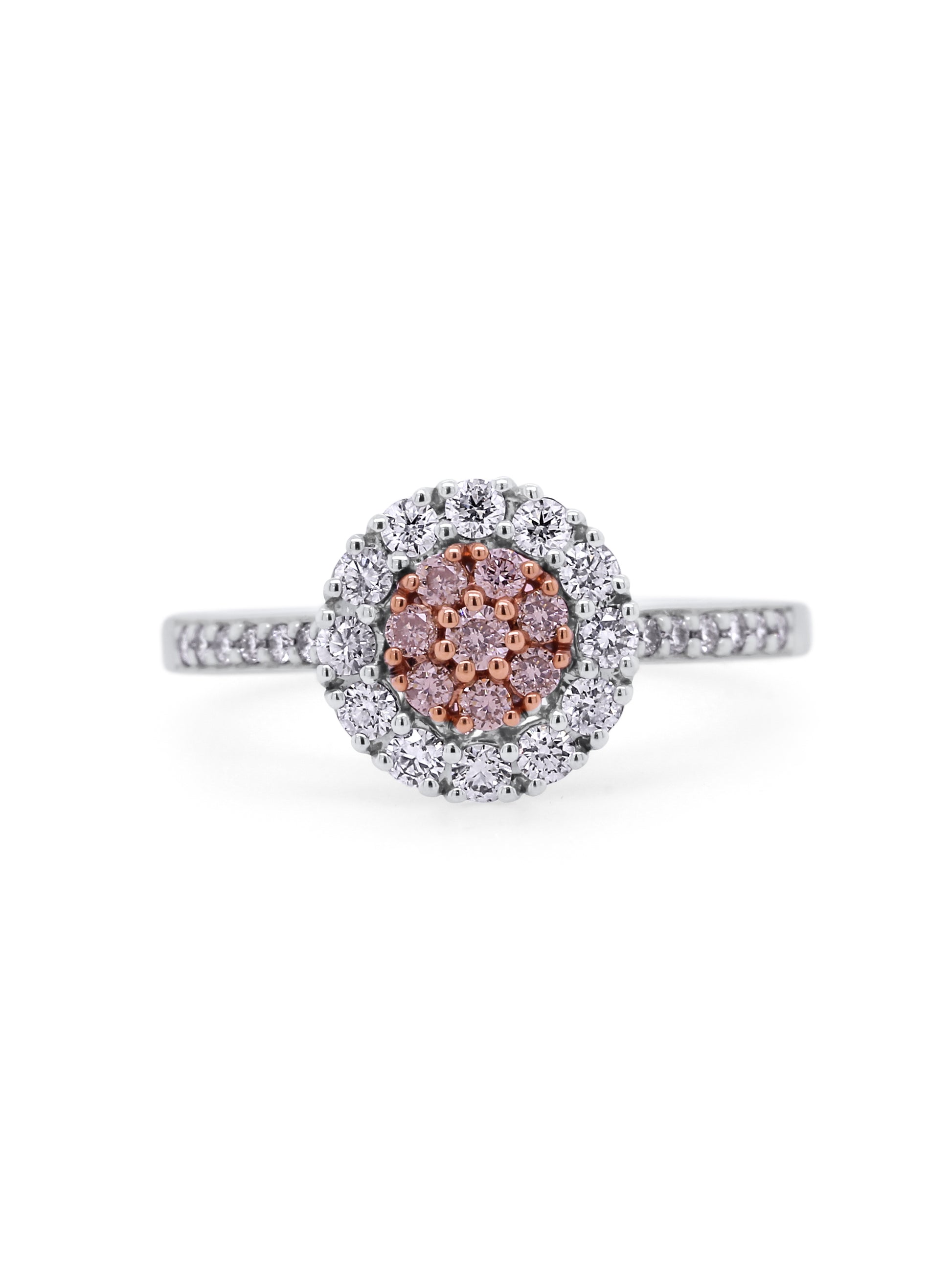 Embrace the beauty of contrast with the Pink & White Diamond Cluster Ring in 18K White Gold. A captivating arrangement of pink and white diamonds totaling 0.55 carats creates a mesmerizing cluster on the lustrous white gold band. This ring blends elegance and vibrancy, making it a unique and cherished accessory.