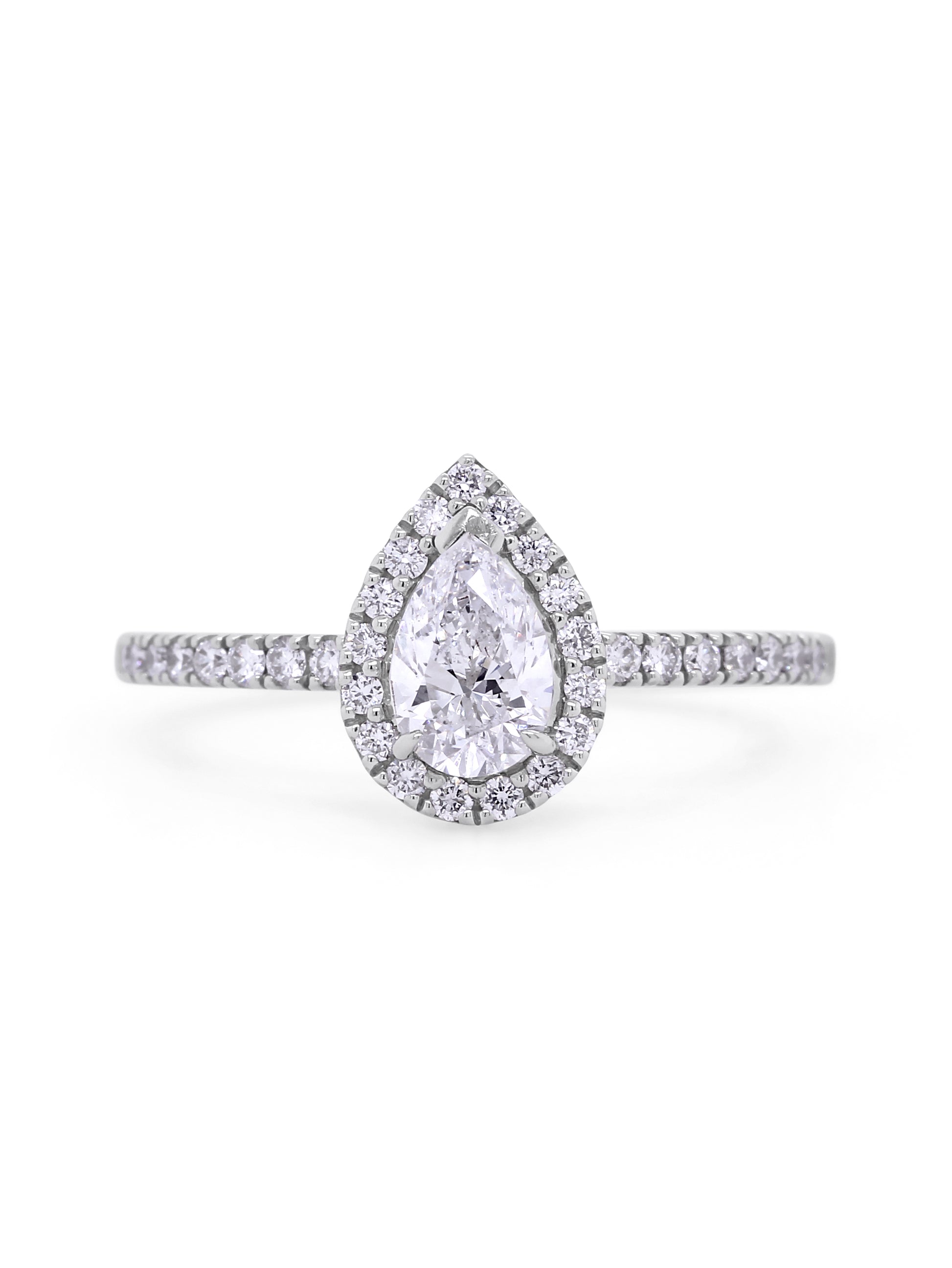 This elegant pear cut diamond ring in 18 carat white gold features a stunning 0.61 carat D colour and SI2 clarity pear-shaped diamond. The halo setting, adorned with 35 sparkling diamonds with H colour and SI clarity totaling 0.29 carats, enhances its brilliance, making this ring a truly exquisite piece.