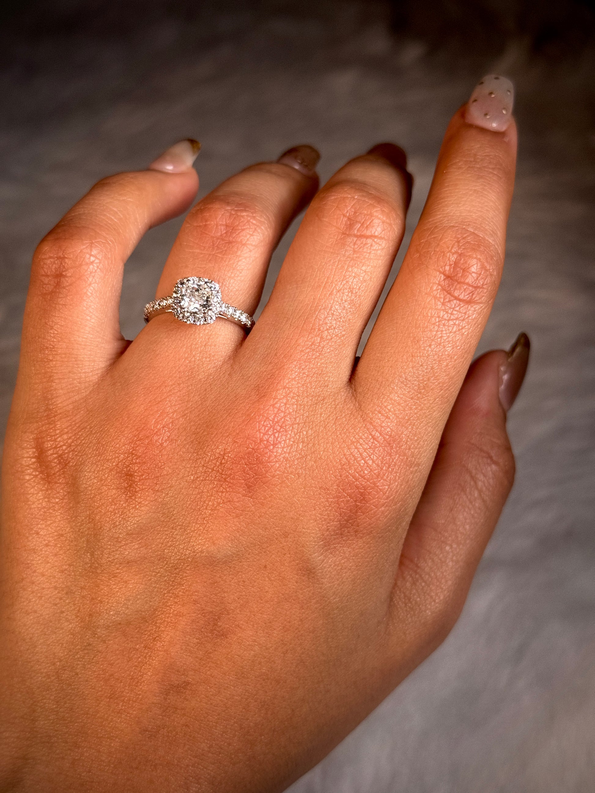 Elevate your style with the Cushion Cut Diamond Halo Ring. This exquisite ring features a dazzling cushion-cut diamond at its center, surrounded by a halo of smaller diamonds, creating a look of timeless elegance and brilliance. Crafted in your choice of precious metal, it exudes sophistication, making it the perfect choice for engagements, anniversaries, or as a stunning addition to your jewelry collection.