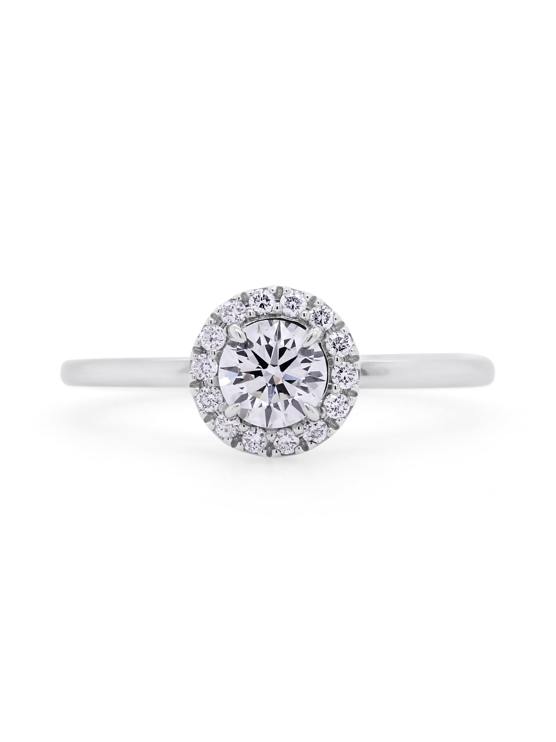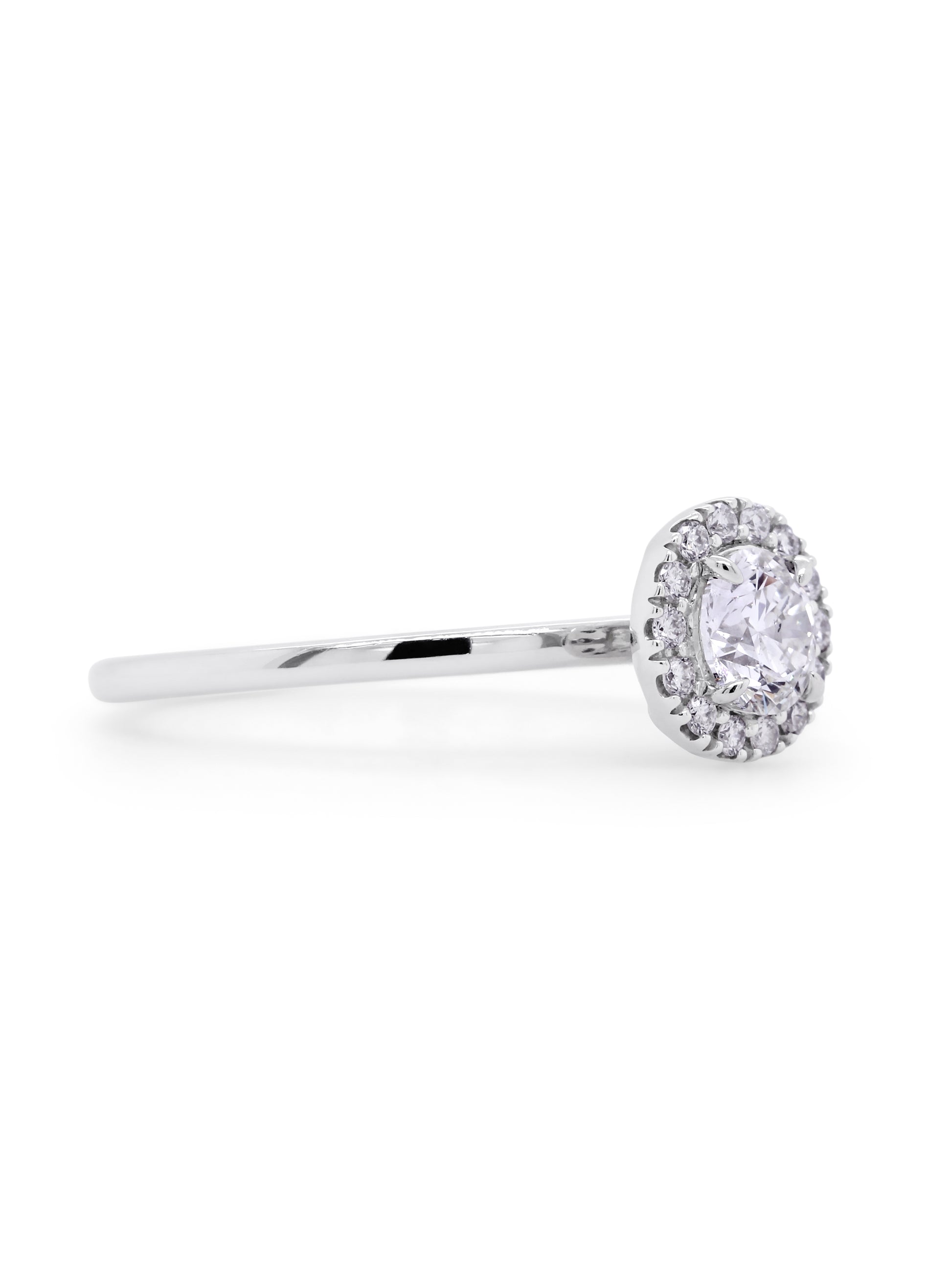 An elegant 18 carat white gold diamond cluster ring featuring a 0.50 carat round brilliant cut centre diamond (G colour, I1 clarity) surrounded by a sparkling halo. Total diamond weight 0.61 carat.