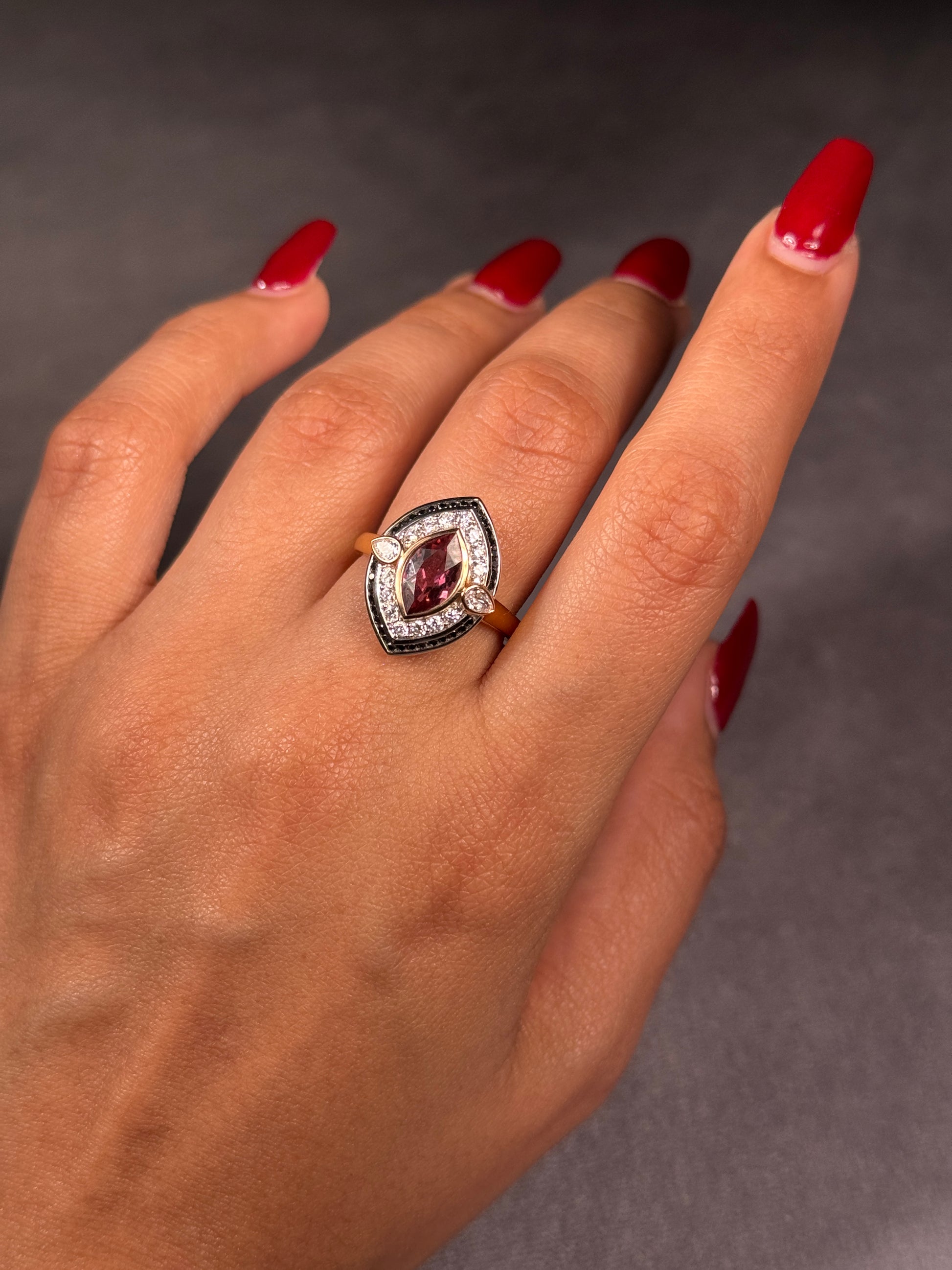 Art Deco Pink Tourmaline & diamond halo dress ring. Tourmaline 16=0.42ct GHSI 34=0.17ct black diamonds 18K YWR Ring.
