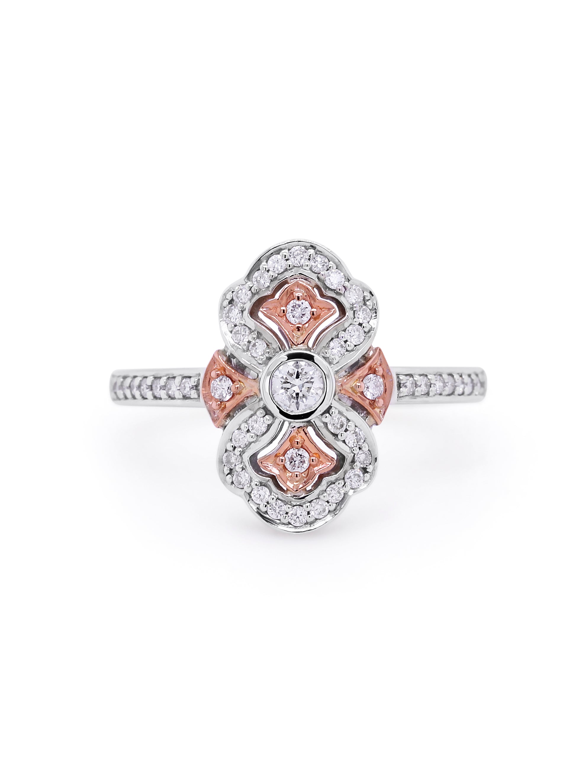 Elegant and unique, this stunning ring features four natural pink diamonds (Lot 1491603) claw set in a warm blush centre, surrounded by a brilliant halo of 43 white diamonds totalling 0.31 carat. Crafted in 9 carat white and rose gold, this design blends rarity, beauty, and sparkle�perfect for special occasions or a luxurious statement piece.
