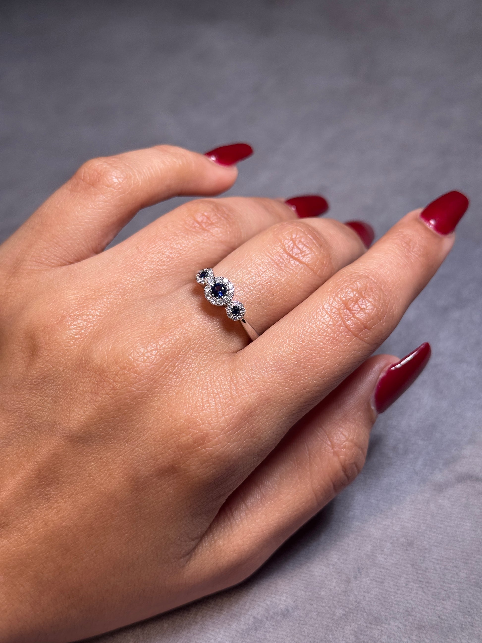 Elevate your style with our Sapphire & Diamond Halo Trilogy Ring in 18K White Gold. Three captivating sapphires are nestled within a sparkling halo of diamonds, creating a stunning trilogy effect. Meticulously crafted, this ring exudes timeless allure and sophistication. Make a statement with this elegant piece, a perfect blend of classic charm and contemporary luxury
