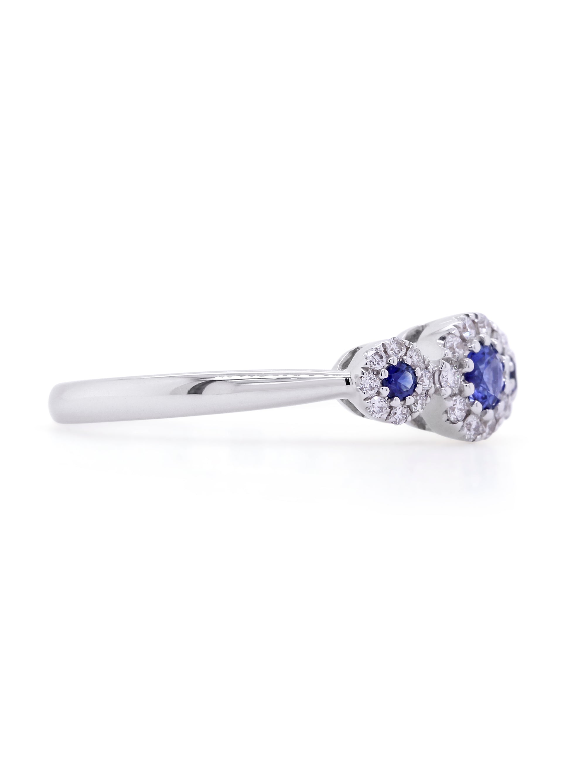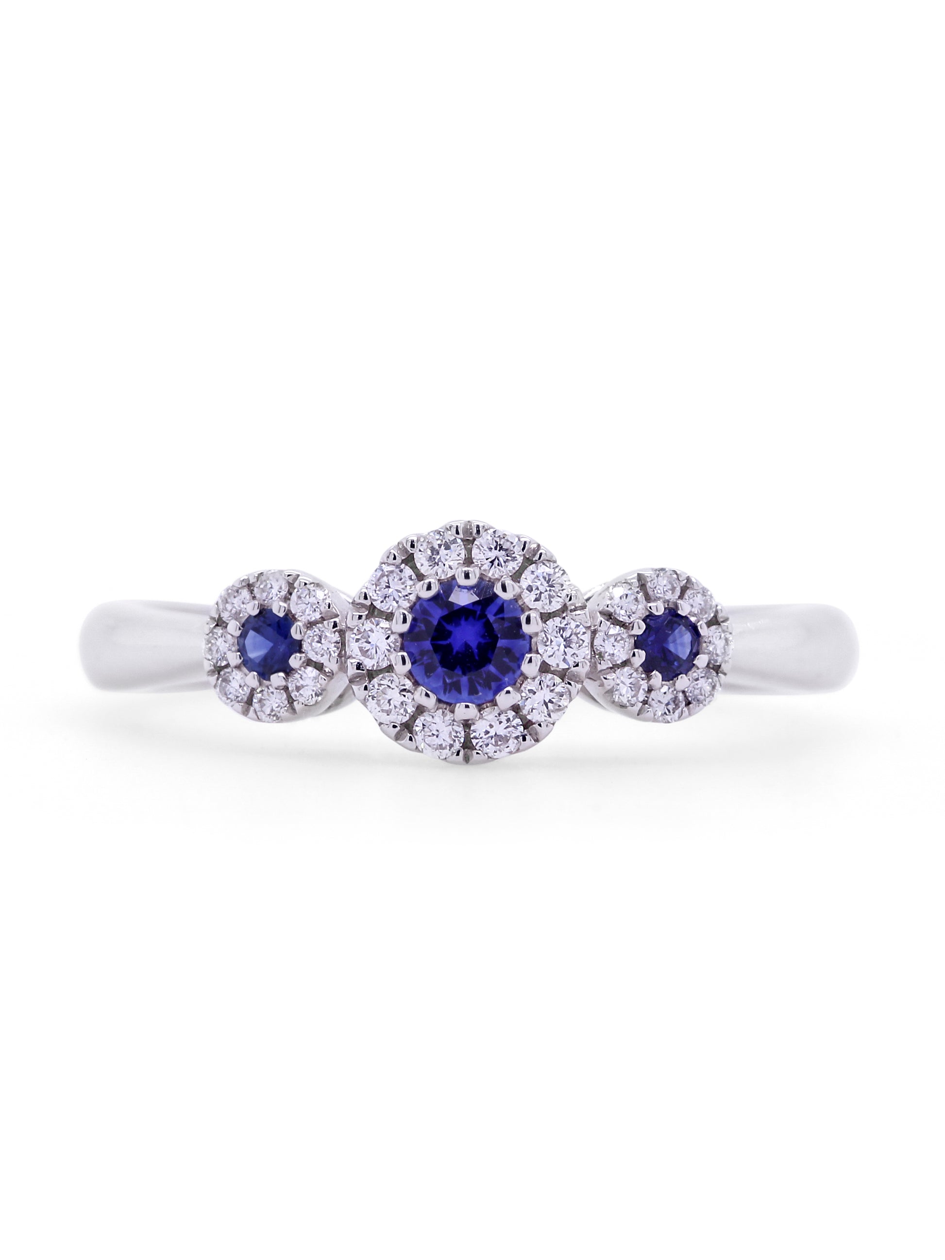 Sapphire & Diamond Halo Trilogy Ring, 18K White Gold.