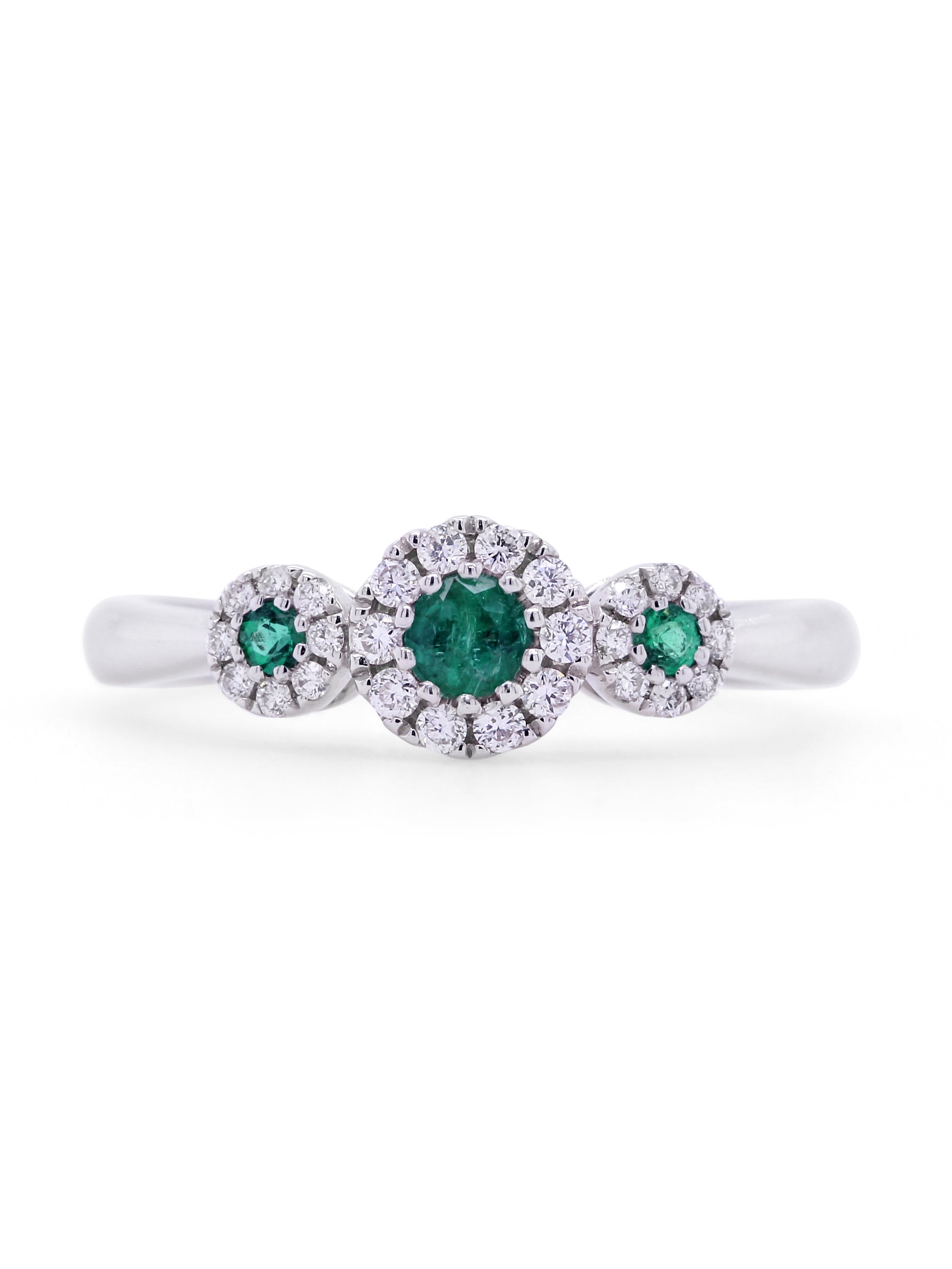 A timeless 18K white gold trilogy ring featuring 3 emeralds (0.16ct total) and 26 round brilliant diamonds (0.17ct total) in a sparkling halo setting.