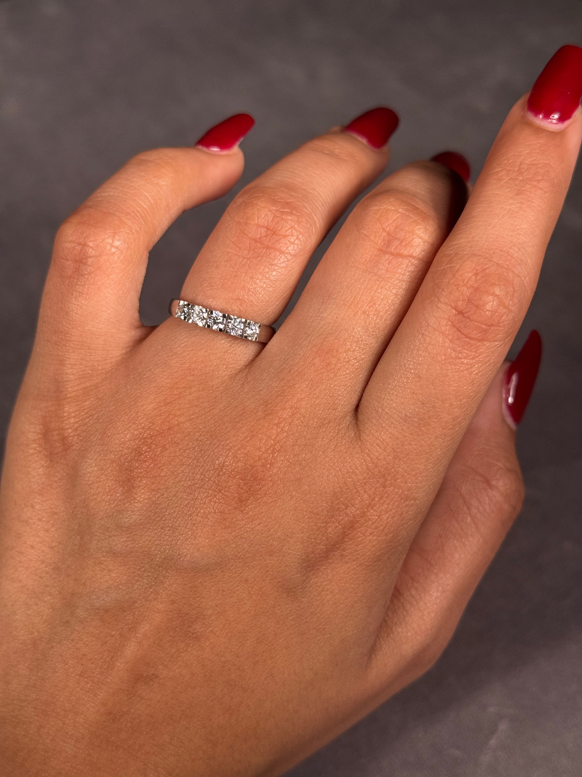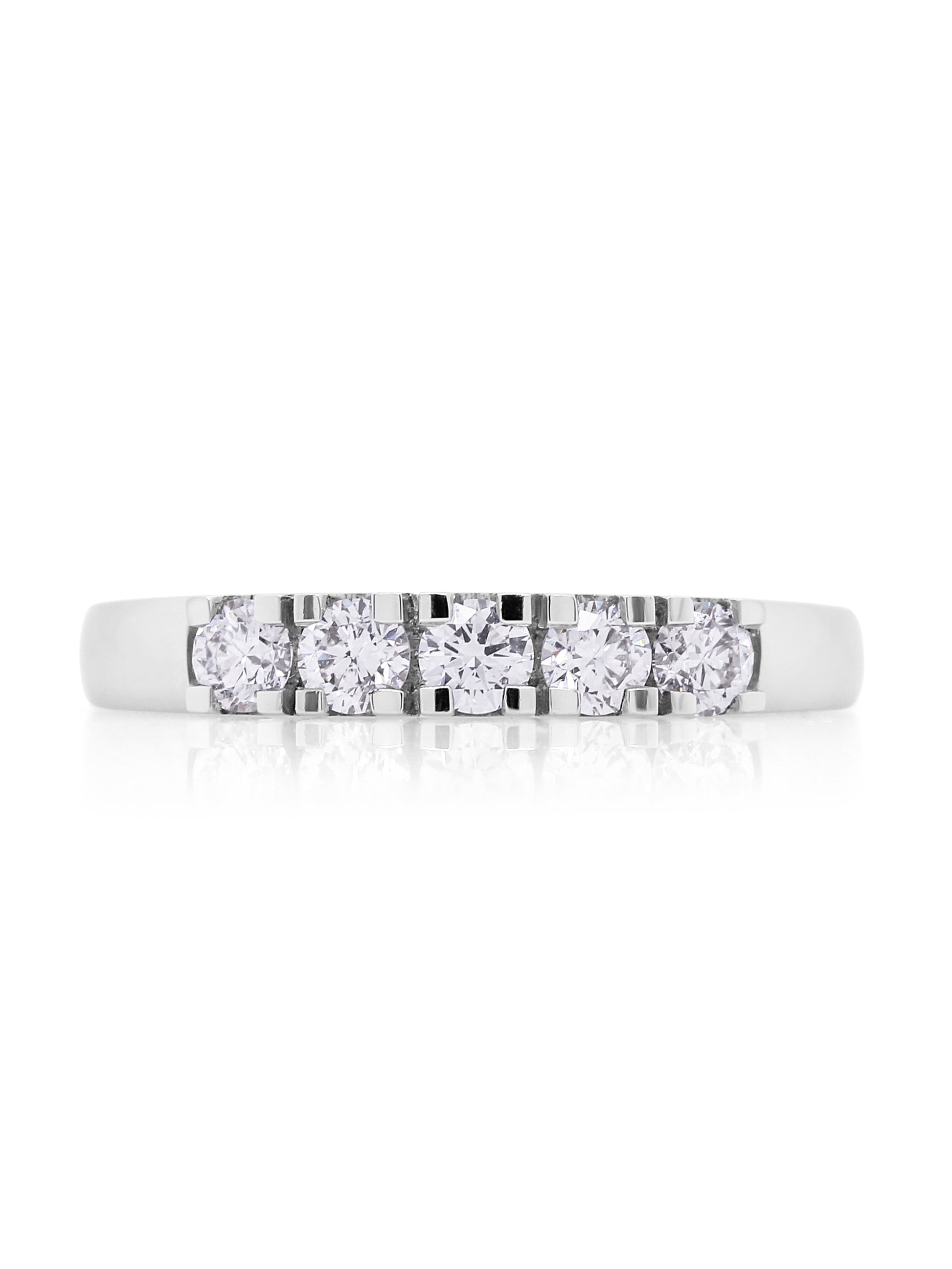 A refined 18K white gold band set with 5 sparkling diamonds, total weight 0.50 carat, offering timeless style and everyday elegance.