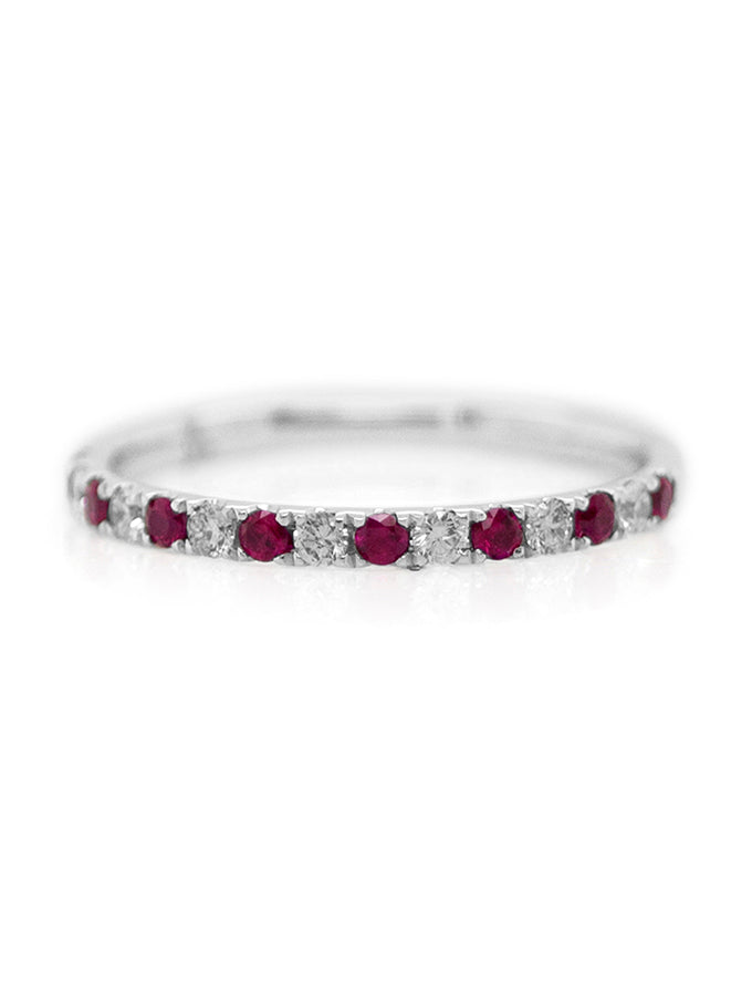 A radiant design in 18 carat white gold, this claw set band features eight vivid rubies (0.20 carat total) and seven natural diamonds (0.17 carat total, G colour, SI clarity). A perfect harmony of fire and brilliance.