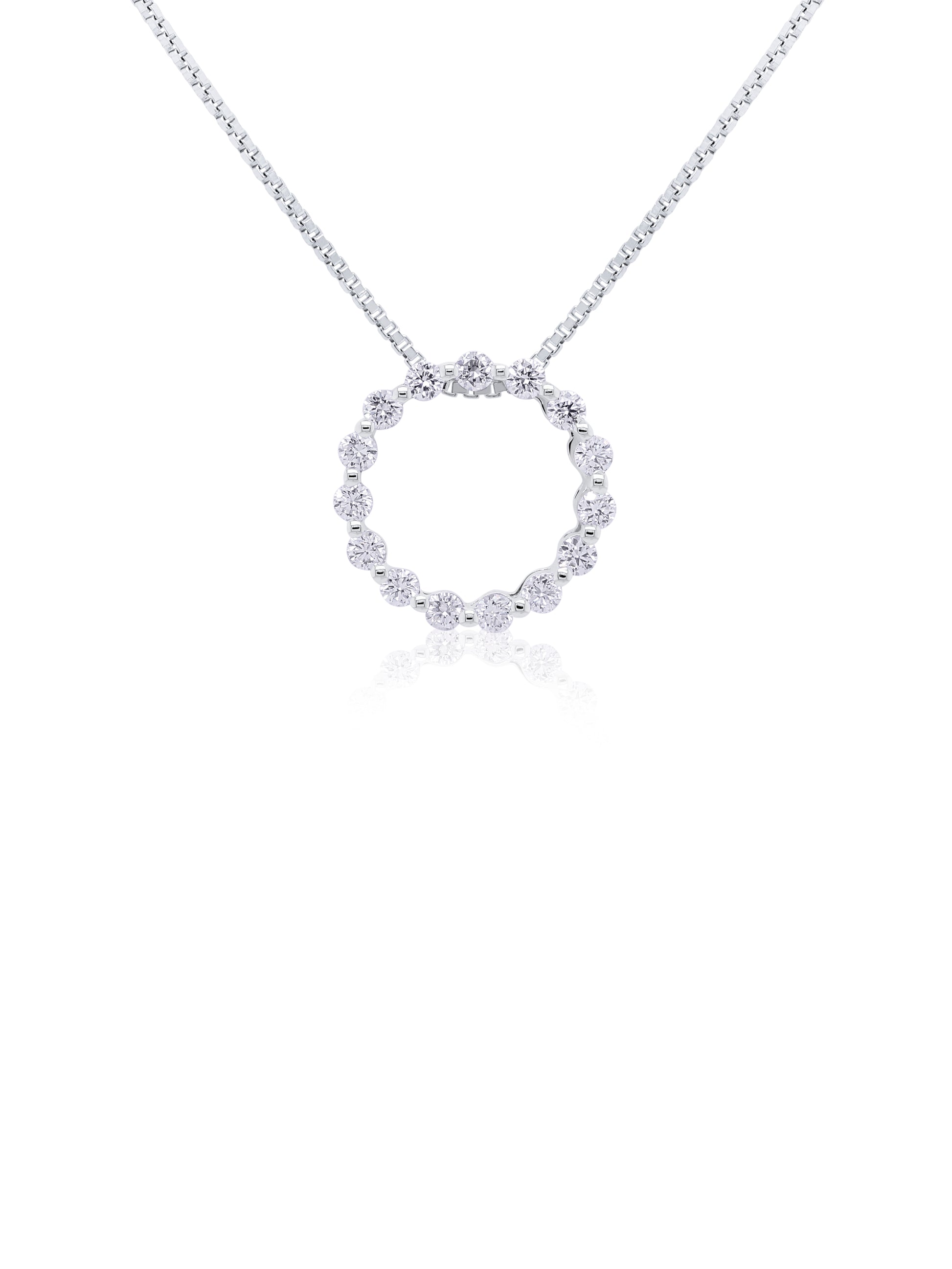 Celebrate timeless beauty with this 18 carat white gold Circle of Life pendant, set with 15 sparkling diamonds totalling 0.41 carat. The elegant circular design symbolises eternity, love, and unitymaking it a meaningful and versatile piece. Finished in radiant white gold and suspended on a plated chain, its perfect for daily wear or gifting a message that lasts forever.