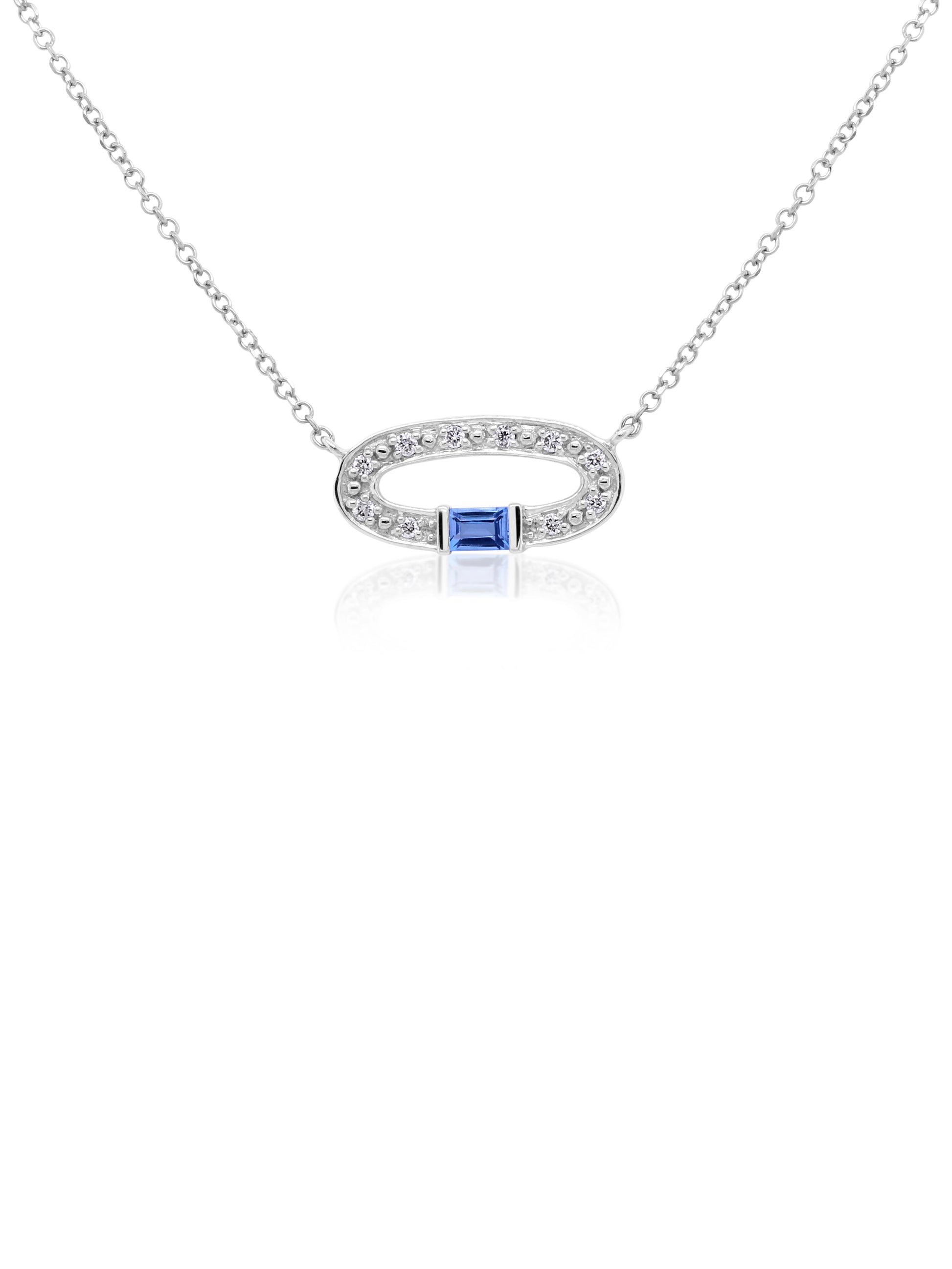 Delicate and dazzling, this 3x2mm baguette-cut blue topaz pendant in 9 carat white gold adds a fresh pop of colour to any look. Framed by ten shimmering diamonds totalling 0.05 carat, the icy blue topaz stands out with its clean, modern lines. Suspended on a 46cm chain, this piece is perfect for elegant layering or a subtle everyday sparkle.