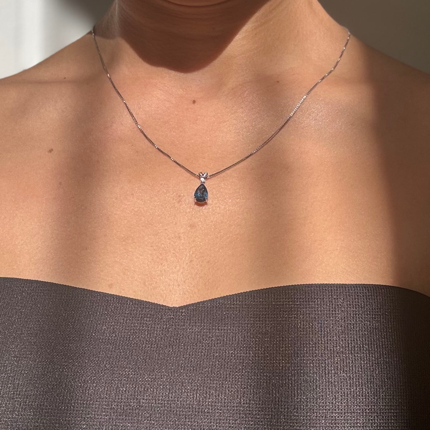 Elegant and alluring, this 9x6mm pear-shaped London blue topaz pendant in 9 carat white gold exudes deep, moody brilliance. Accented with three sparkling diamonds totalling 0.015 carat, the rich blue hue stands out with timeless charm. Suspended on a fine chain, this piece is perfect for adding a touch of sophistication to your everyday or evening look.
