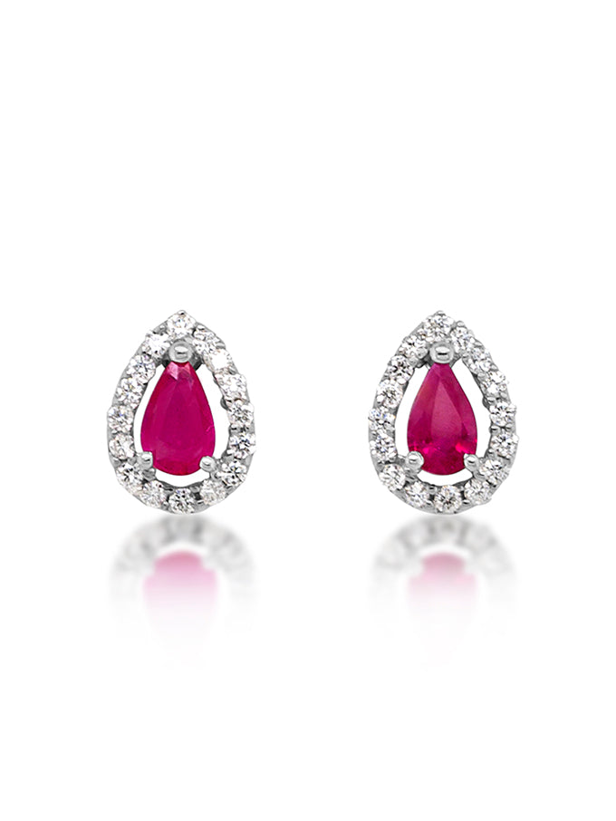 Discover our 3x5mm 0.52ct Pear Cut Ruby & Diamonds Tear Stud EarringÂa harmonious blend of grace and brilliance. Crafted in elegant 9K White Gold, these stud earrings feature a vibrant pear-shaped ruby, surrounded by sparkling diamonds. Meticulously set in fine detail, they add a touch of sophistication and glamour to any ensemble.