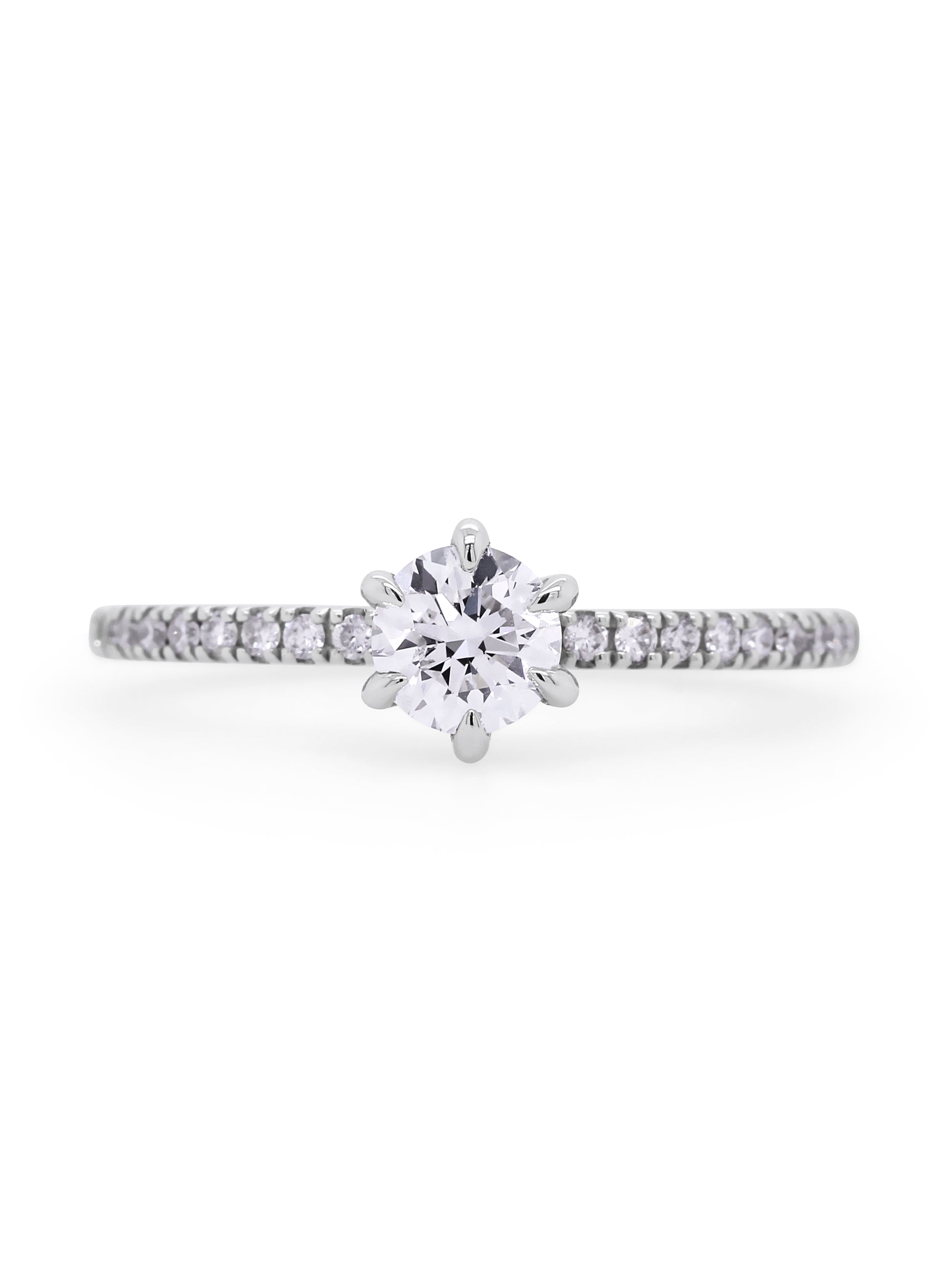 A timeless 18 carat white gold engagement ring featuring a 0.50 carat round brilliant cut diamond (D colour, SI2 clarity, GIA certified) with 18 accent diamonds for added sparkle.
