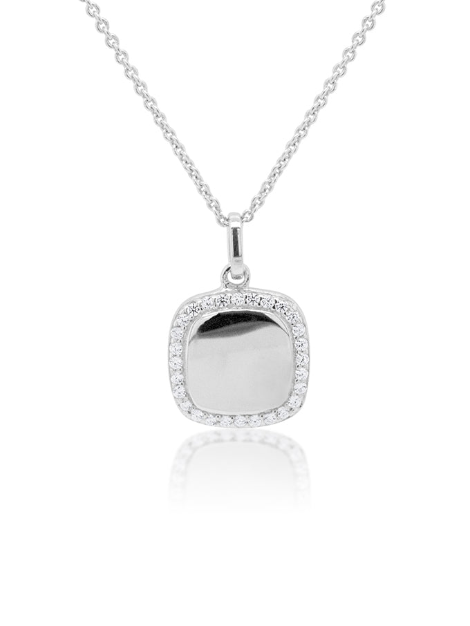 Sterling silver cubic zirconia set 9mm cushion disc pendant, placed delicately on a 45cm chain
