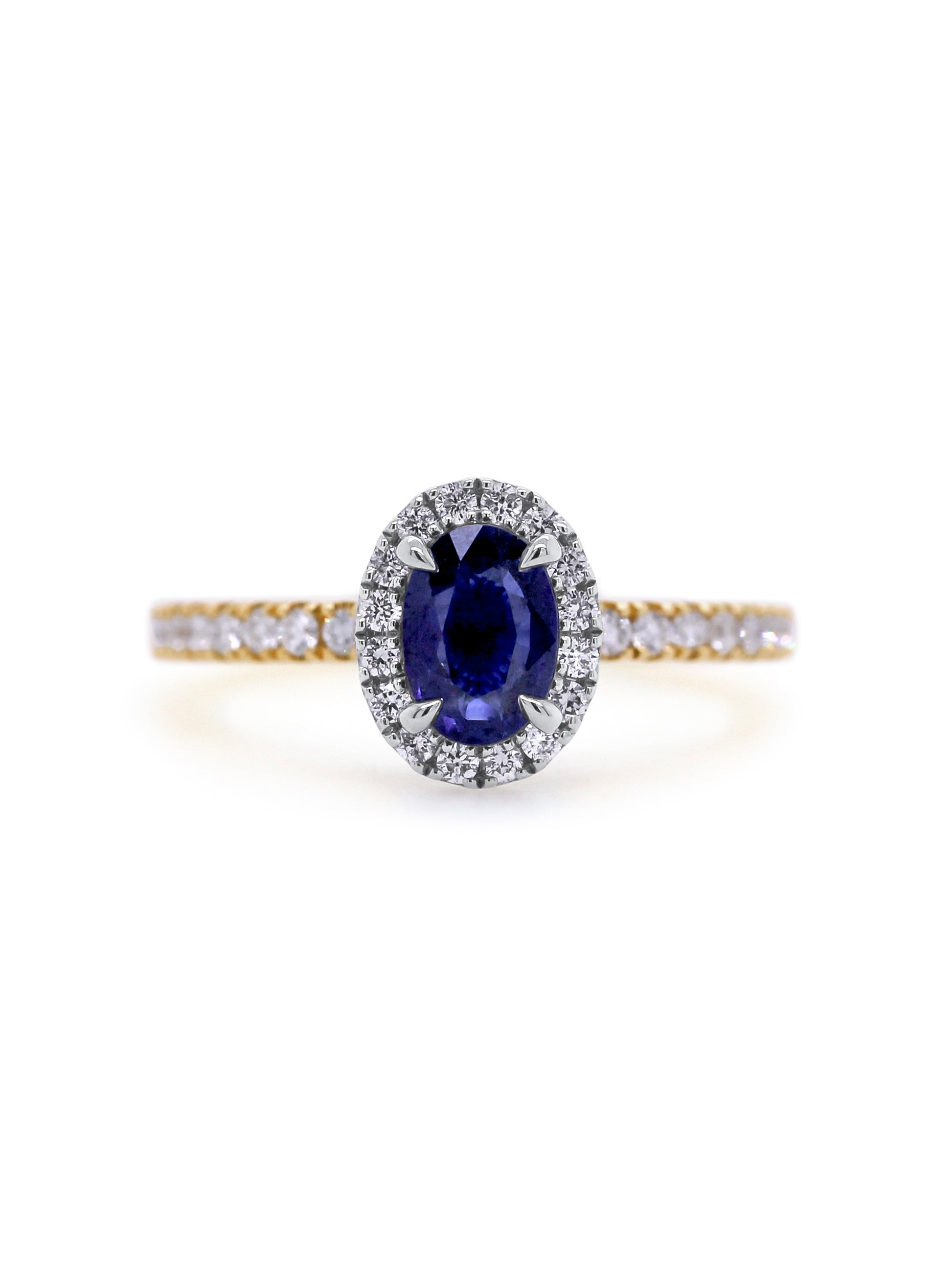 This oval sapphire and diamond ring is crafted in 18 carat yellow gold, showcasing a rich blue oval sapphire surrounded by a sparkling diamond halo. A timeless and elegant design that delivers classic luxury with refined brilliance available Australia-wide.
