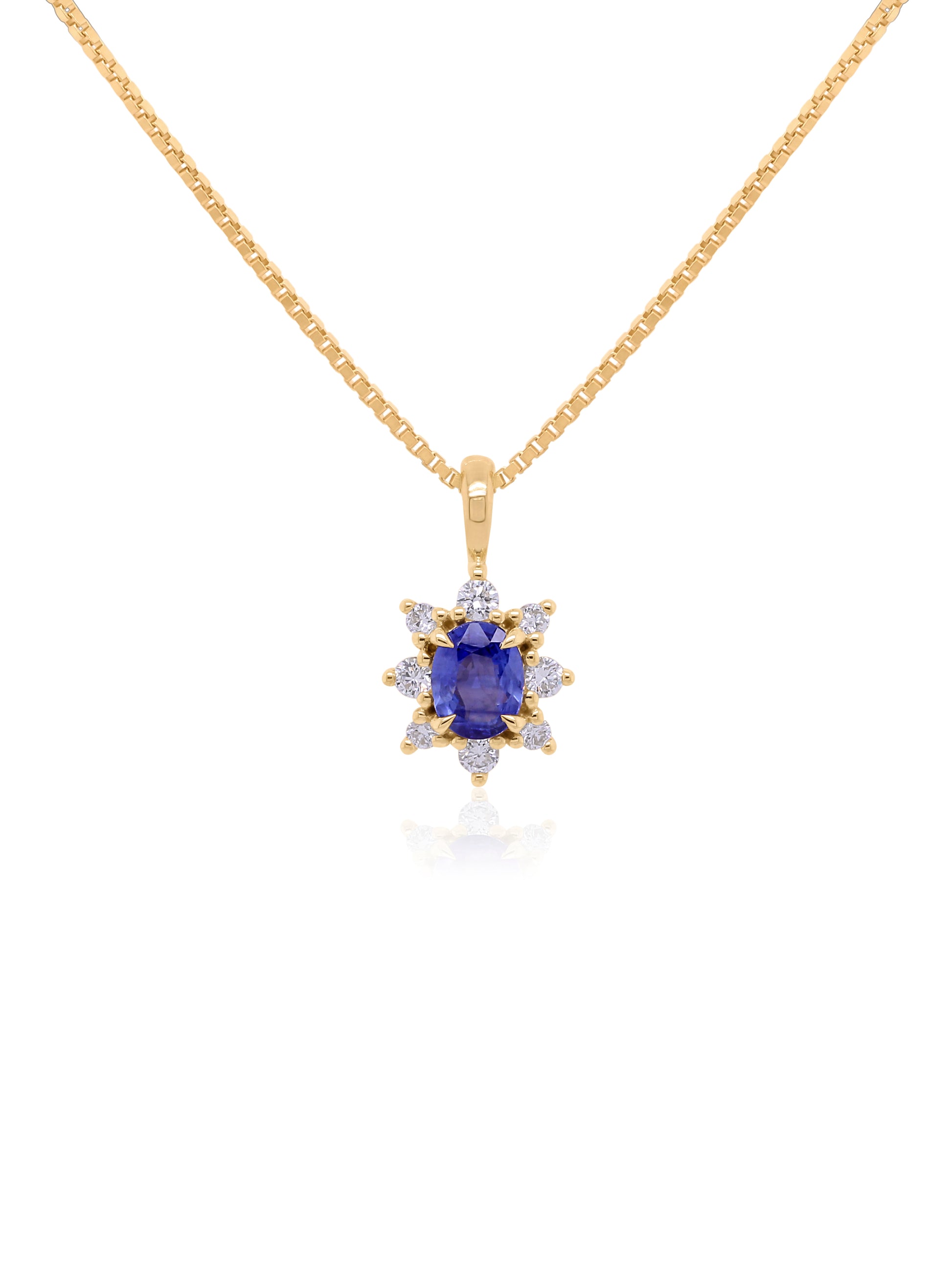 Design: Cluster pendant with sapphire at the center, surrounded by diamonds