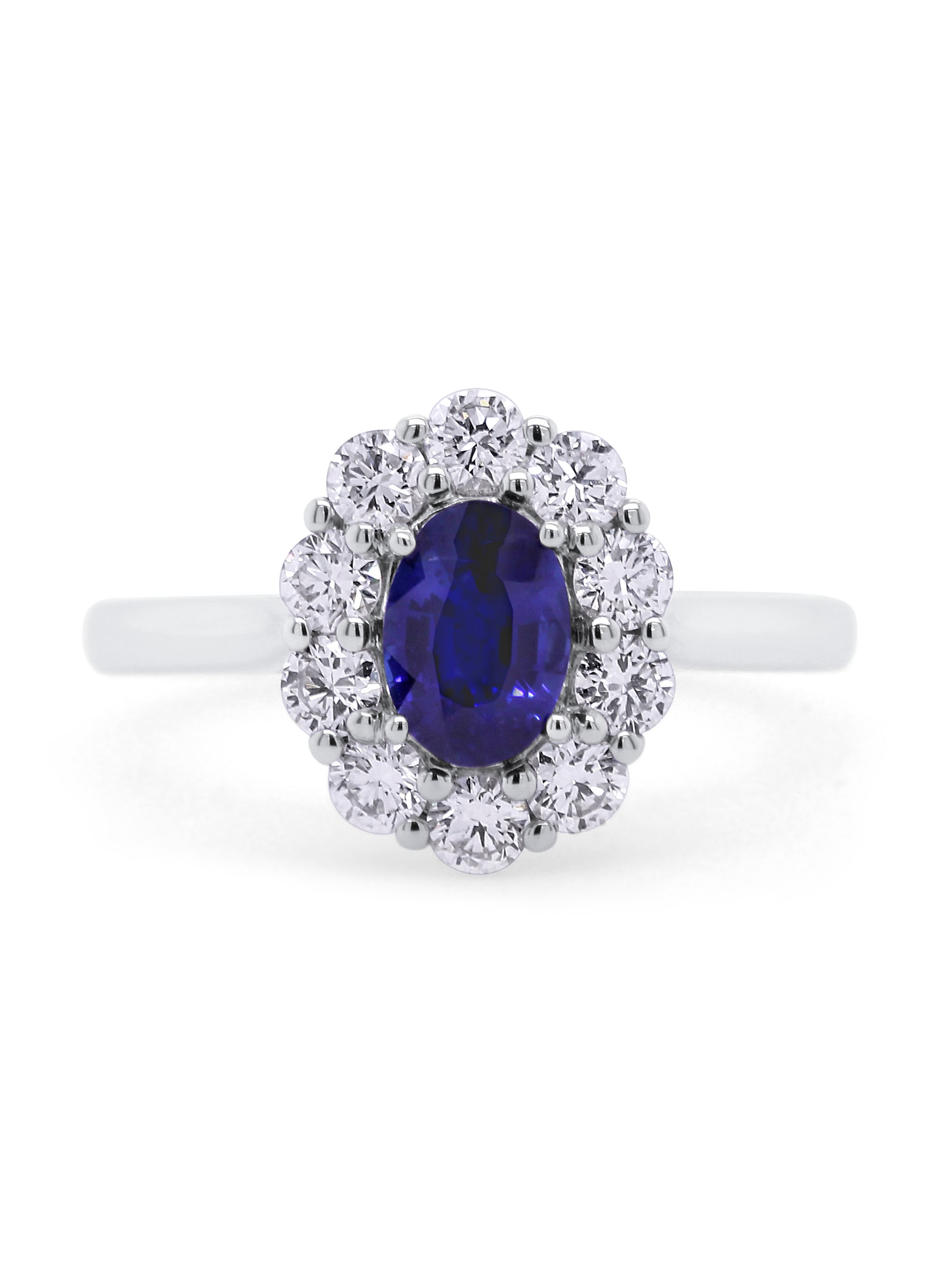 A stunning cluster engagement ring in 18K white gold featuring a vibrant 7x5mm natural sapphire, accented with 10 lab-grown diamonds (0.70ct total, D color, VS clarity) for an elegant, timeless look.