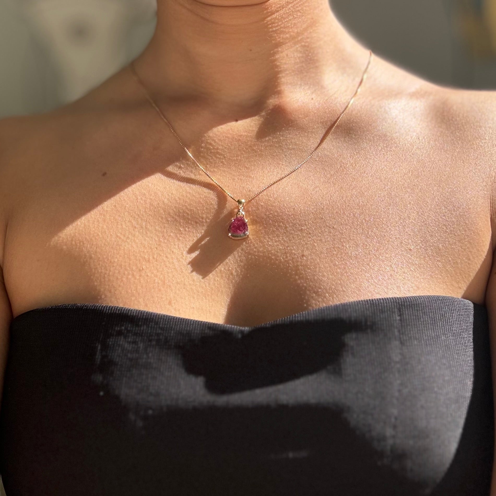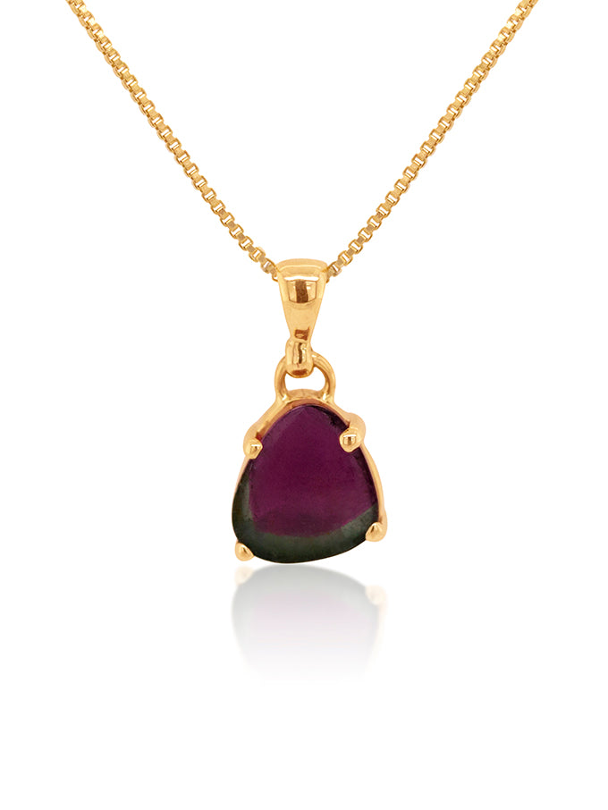Embrace vibrant hues with this striking pendant featuring a 10.5x10mm watermelon tourmaline set in 9-carat yellow gold. The unique color gradient from pink to green brings a playful yet elegant touch to any outfit. The warm gold setting enhances the rich colors, creating a piece that radiates energy and style. Perfect for those who love to express their personality through jewelry.