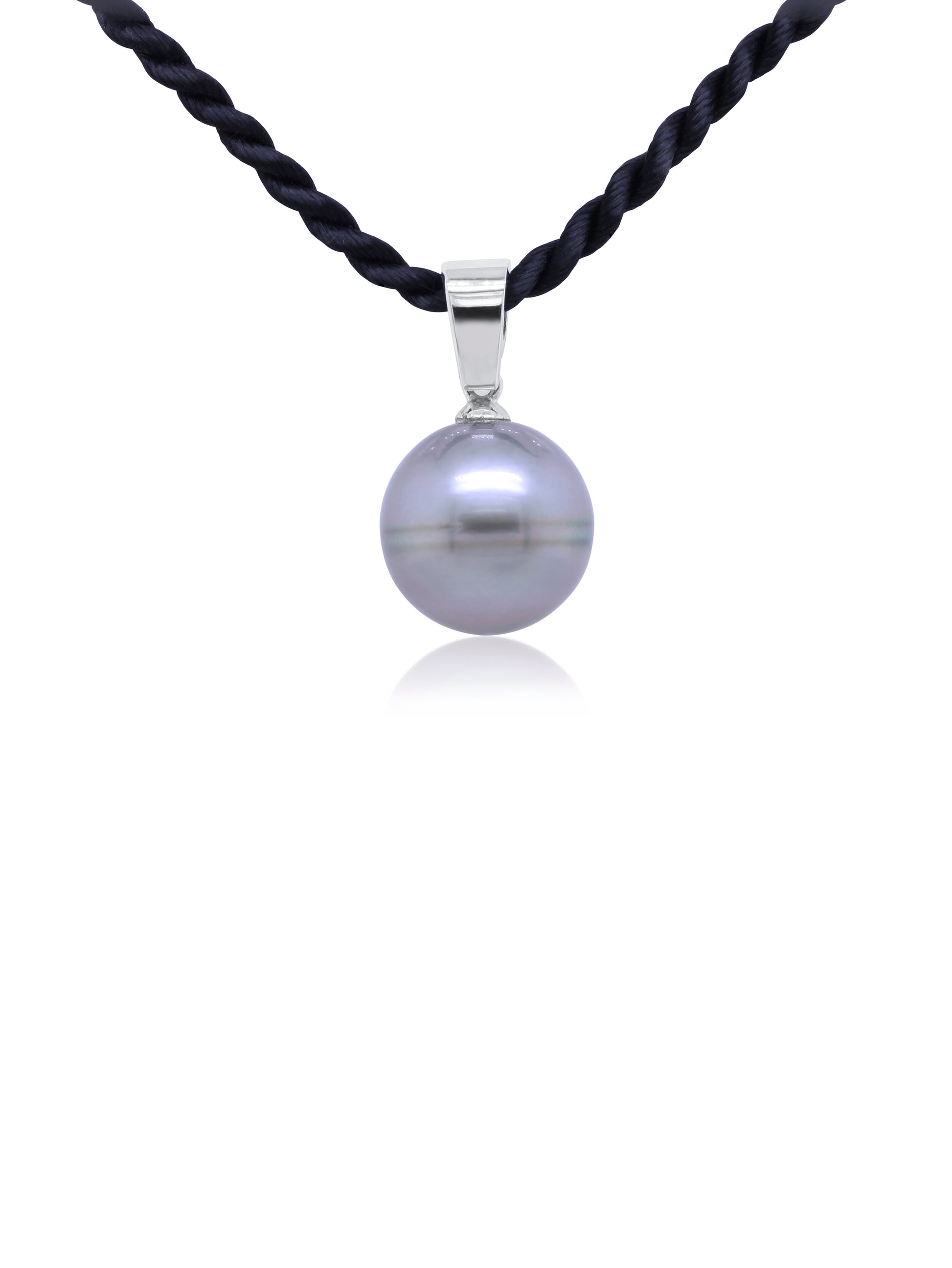 A modern classic, this pendant showcases a 13mm natural Tahitian pearl, prized for its deep lustre and oceanic tones. Set in sterling silver and paired with a 45cm black satin necklace, it blends simplicity with elegance—making it a versatile piece for both everyday wear and special occasions.