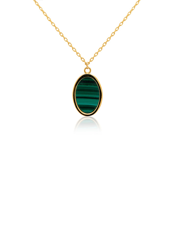 The stunning malachite stone, with its rich green hues and unique patterns, exudes natural beauty and elegance. Set in a delicate oval frame of yellow gold, this necklace offers a timeless and sophisticated appeal. Perfect for adding a touch of luxury to any ensemble, it's a versatile piece that will surely make a statement wherever you go.