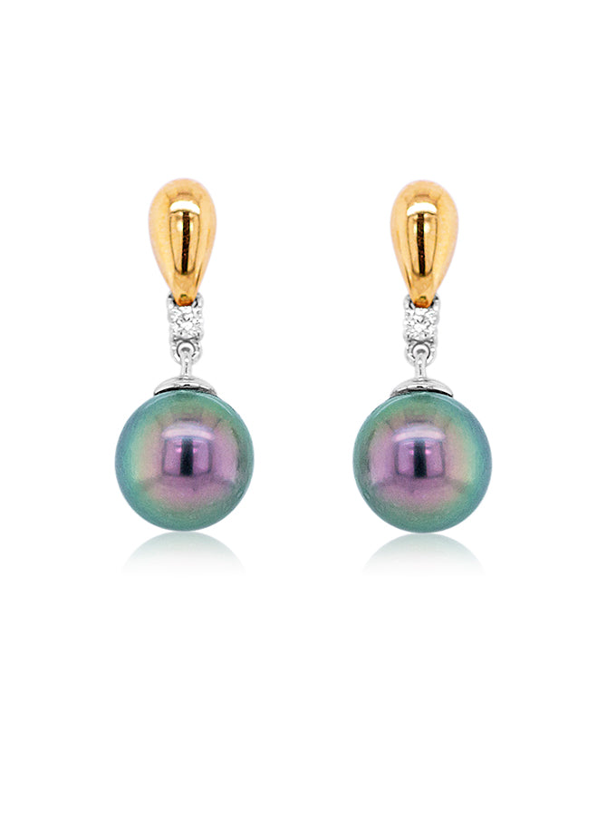 Tahitian Pearl Drops, Diamond set 0.07ct, 18K Yellow Gold, 9mm