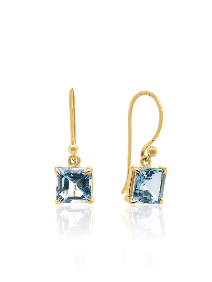 Square Blue Topaz Shepherd Hook Drop Earrings in 9 Carat Yellow Gold.