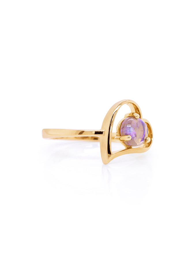 This enchanting 6mm round solid opal ring in 9 carat yellow gold features a captivating heart design. The claw set opal shimmers with a mesmerizing play of colors, making this ring a beautiful and unique addition to any jewelry collection.