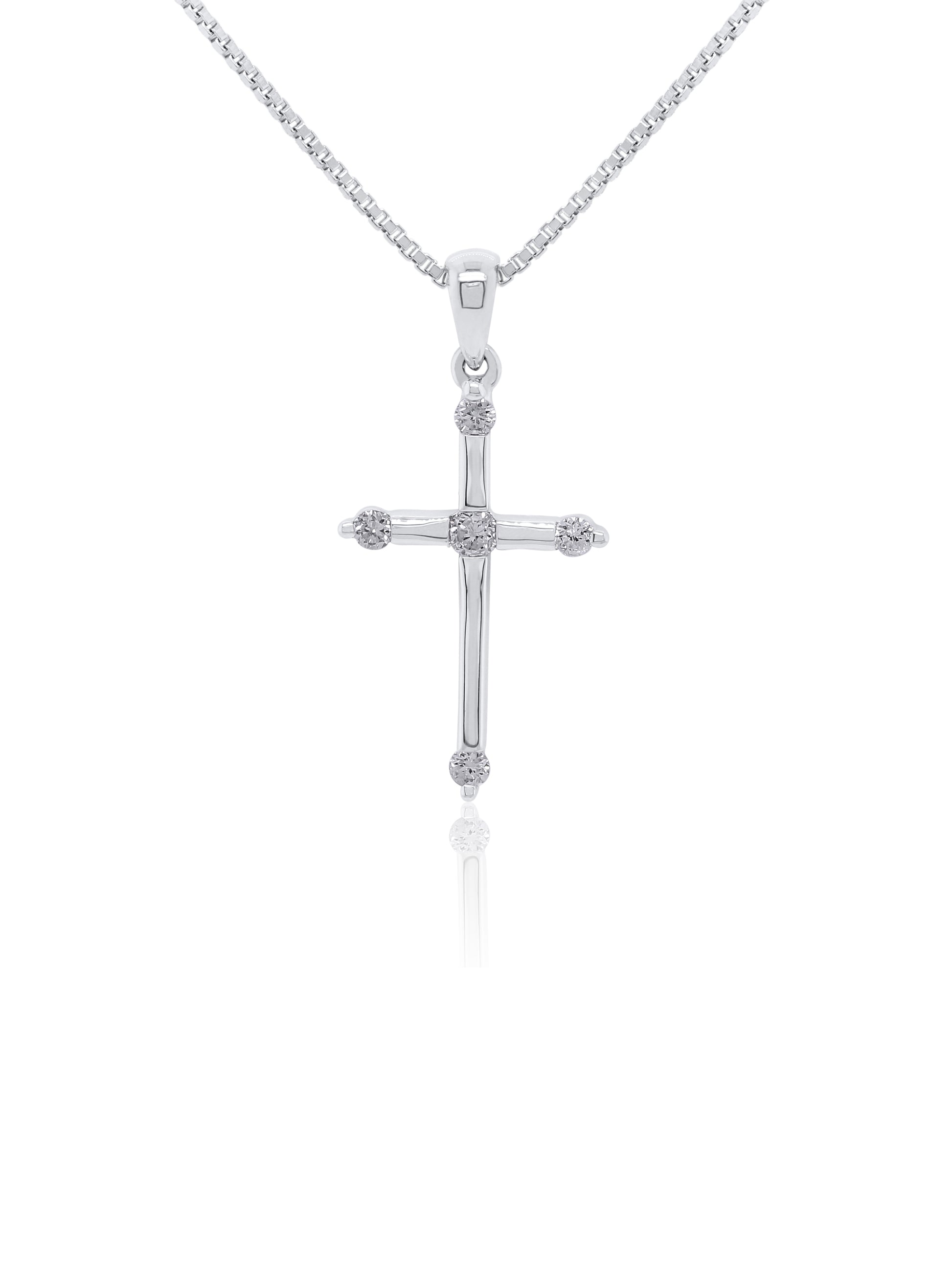 This elegant cross pendant is a timeless symbol of faith and beauty. Crafted in 9 carat white gold and set with five round brilliant cut diamonds totalling 0.20 carat (H colour, SI clarity), it hangs gracefully from a sleek silver chain. A classic piece to treasure forever or gift with meaning.