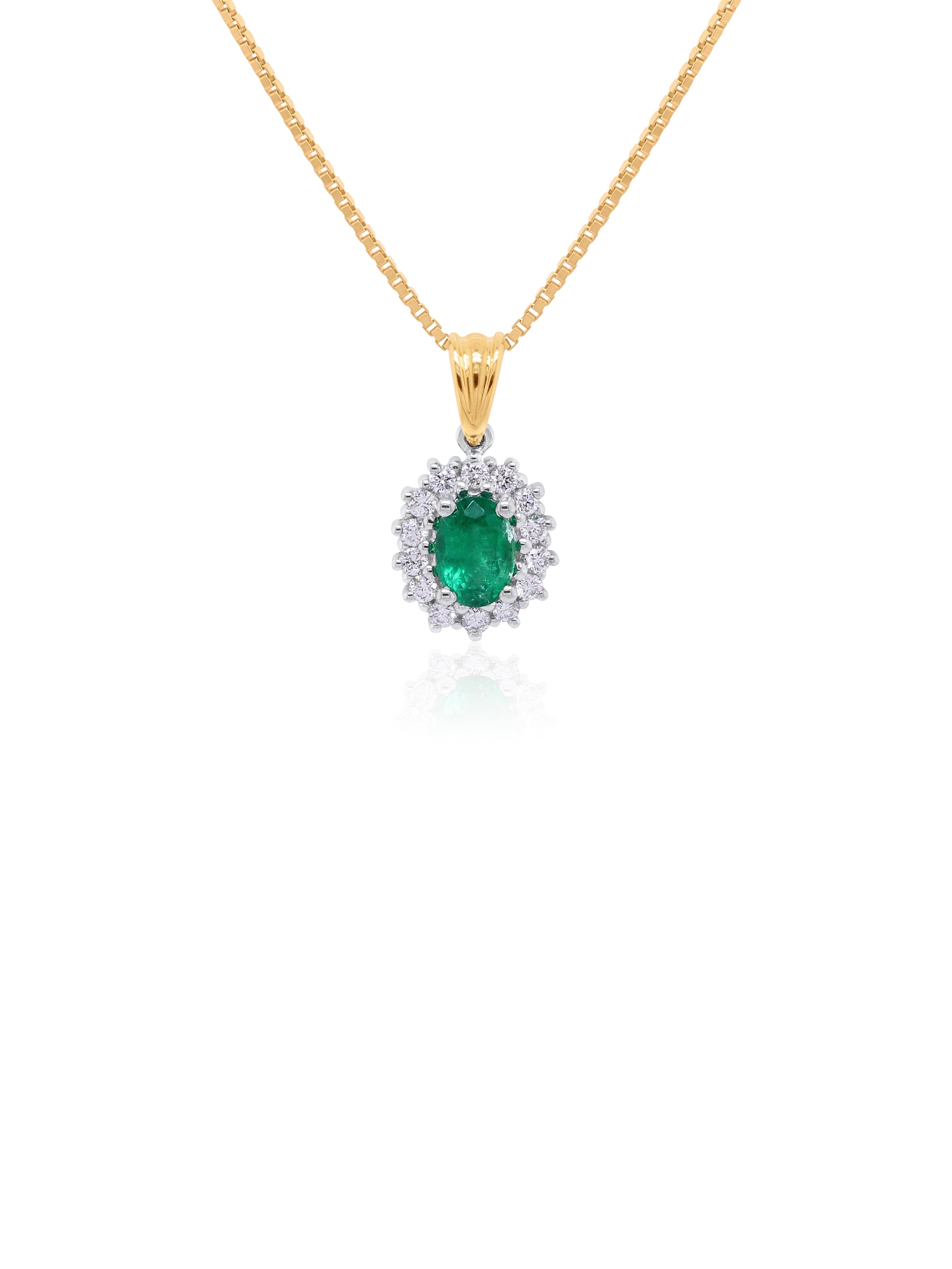 Add a vibrant pop of colour with this striking emerald and diamond pendant. Crafted in 18 carat yellow and white gold, the 7x5mm oval emerald is surrounded by sparkling round brilliant cut diamonds totalling 0.31 carat (H colour, SI clarity), all claw set in a graceful cluster. Comes with a plated chain, making it ready to wear or gift.