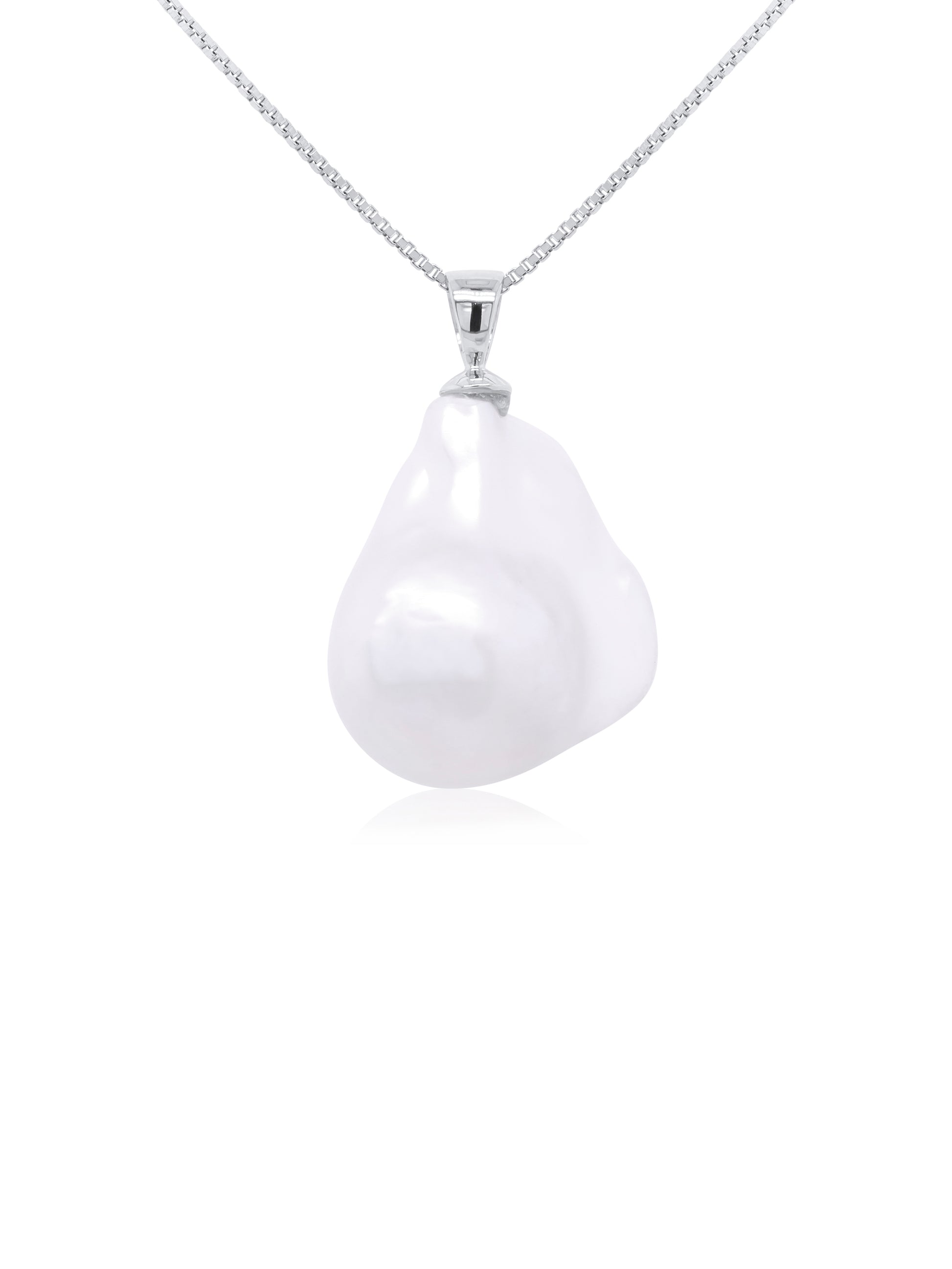 Celebrate natural beauty with this striking freshwater pearl wedge pendant in 9 carat white gold. Featuring a 1423mm organically shaped pearl, each piece is unique in form and iridescence. Suspended from a silver chain, this pendant offers a modern, minimalist aesthetic while keeping the organic charm of real pearl alive. Perfect for everyday elegance or as a one of a kind gift.