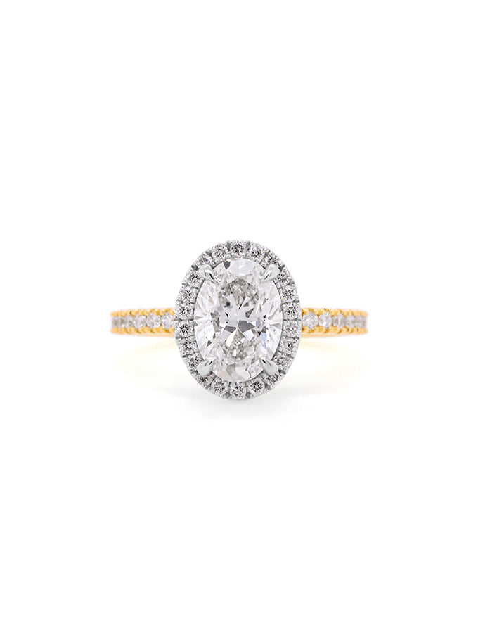 A breathtaking lab-grown diamond halo cluster ring in 18 carat yellow and white gold. Featuring a 2.00 carat E colour VS1 clarity oval diamond at the center, surrounded by 40 sparkling diamonds totaling 0.47 carat.