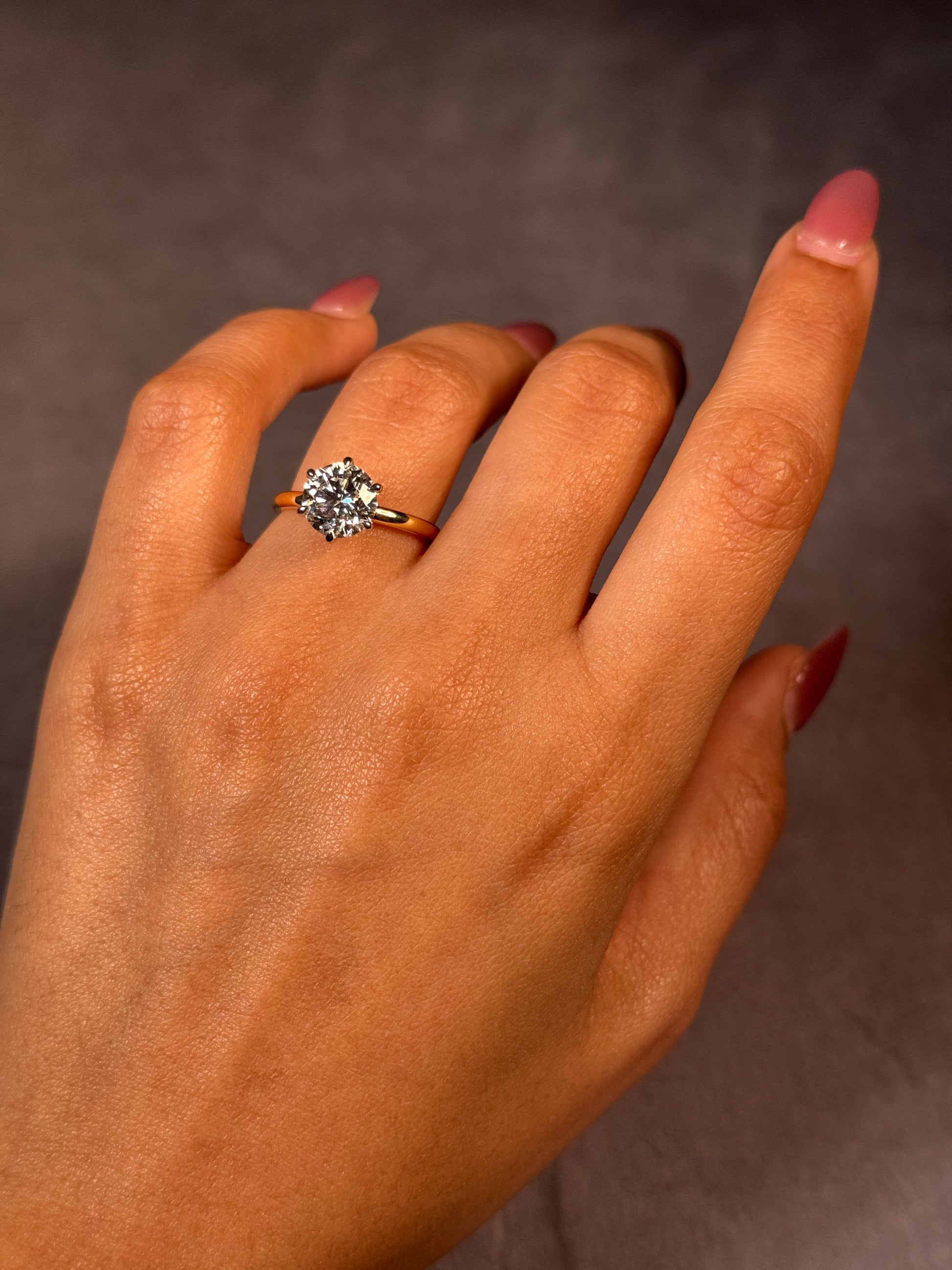 2.50 carat lab grown diamond ring in 18 carat yellow gold with white gold claws. E colour, VS1 clarity. A timeless choice for engagement or anniversary. IGI certified.