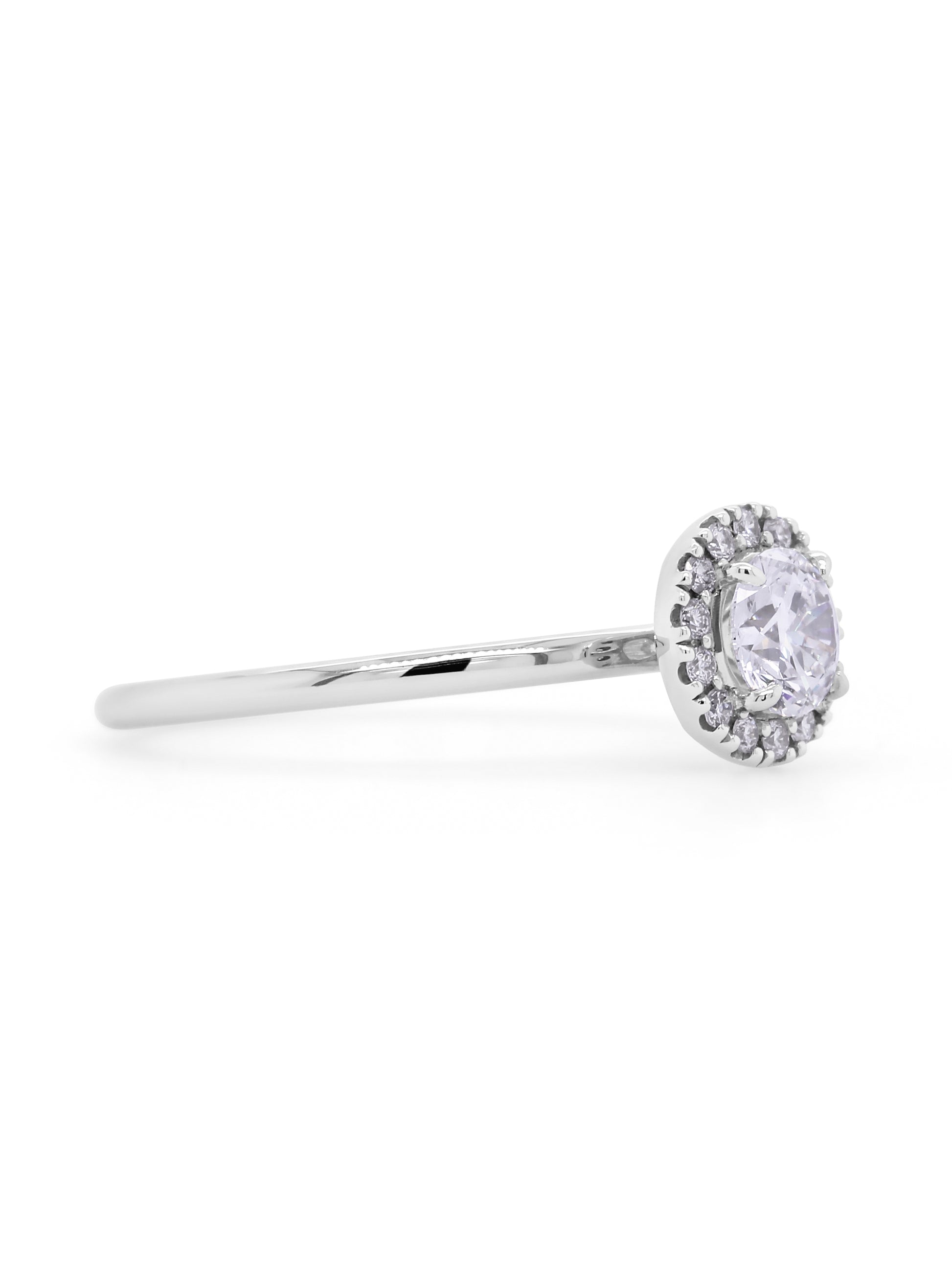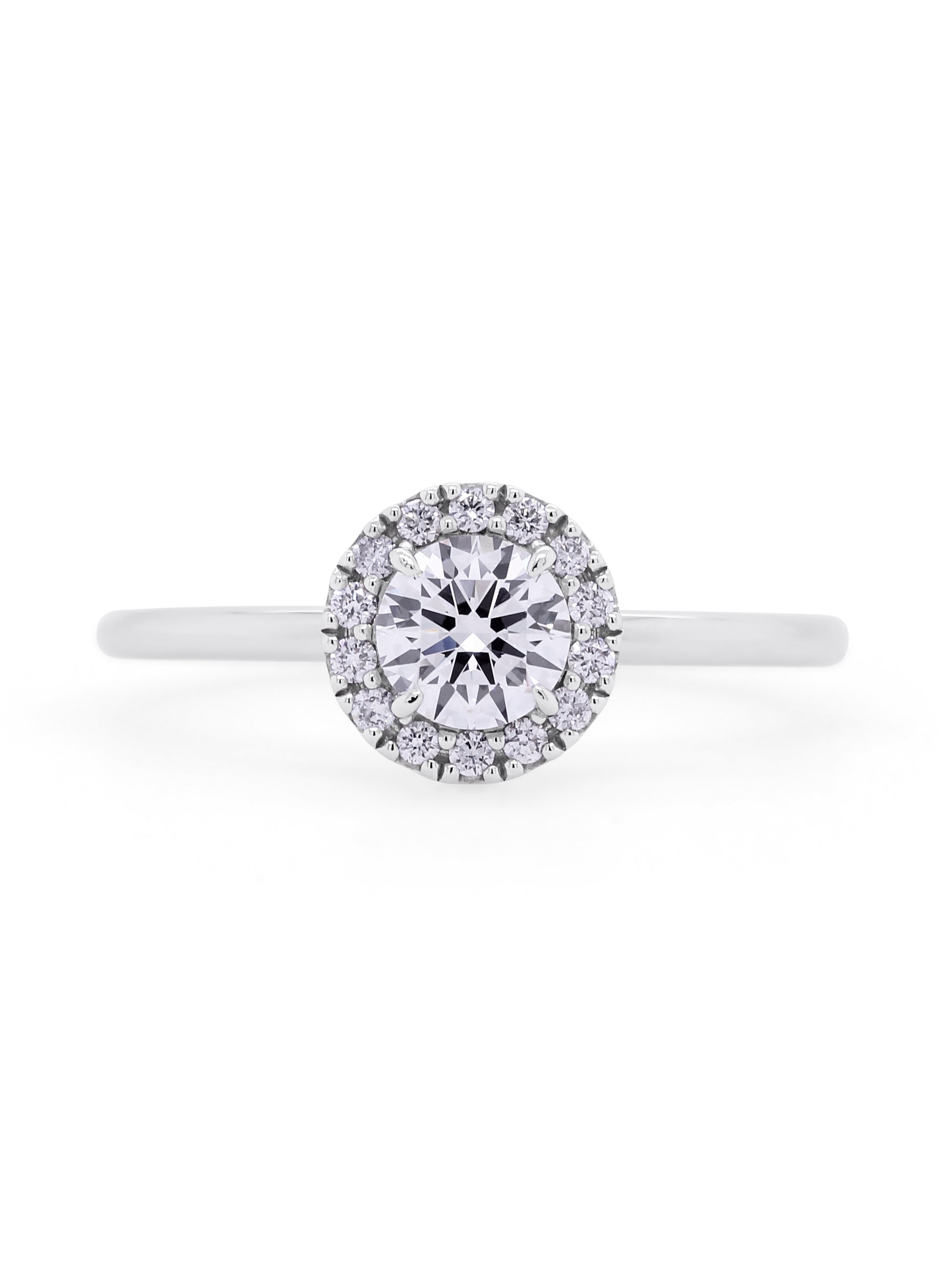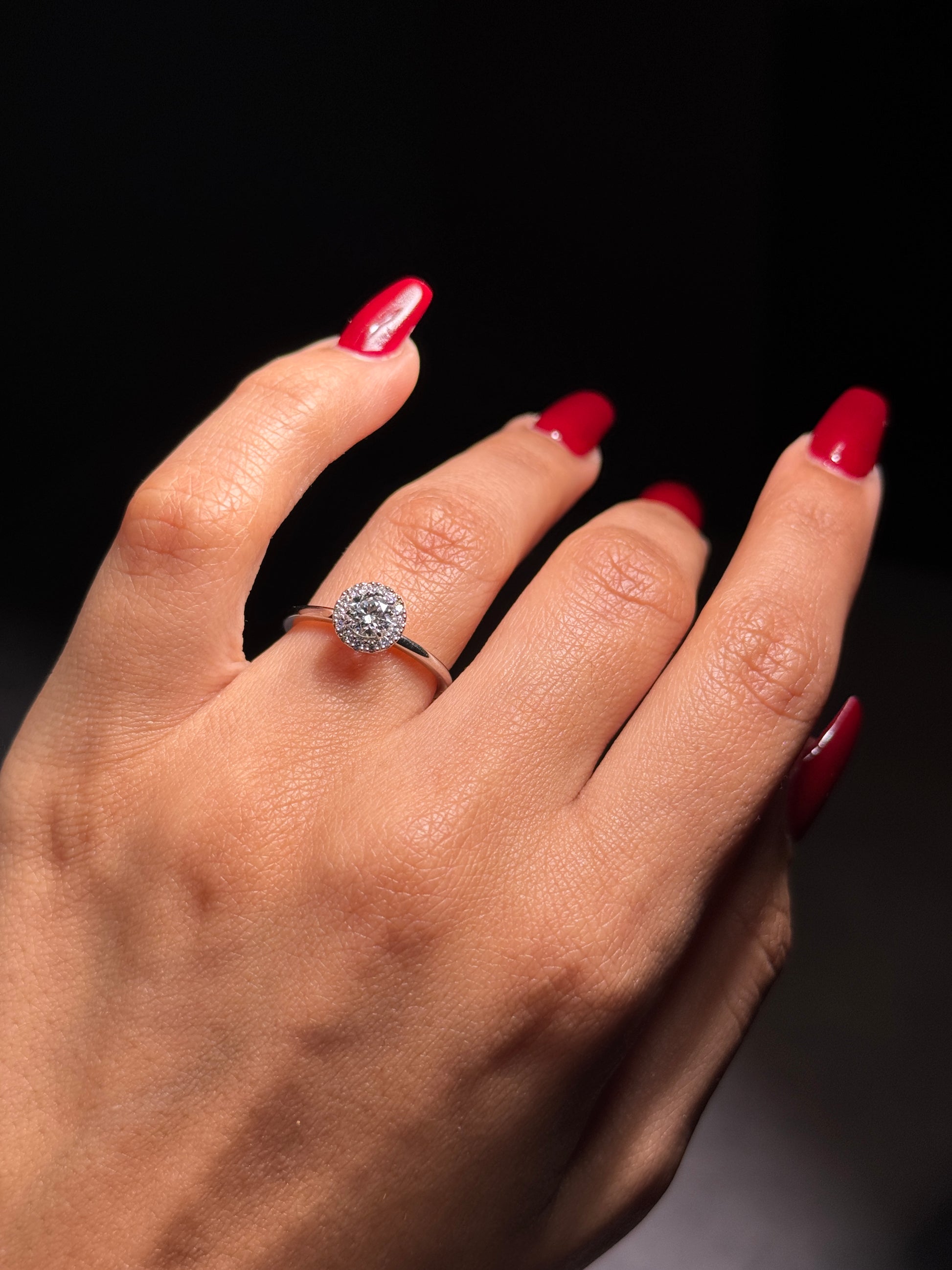 This sparkling cluster ring features a 0.50 carat lab grown centre diamond of exceptional D colour and VS1 clarity, beautifully surrounded by a halo of 14 lab grown diamonds totalling 0.11 carat. Crafted in premium 18 carat white gold, this timeless design delivers brilliance, quality, and sustainabilitymaking it a perfect choice for modern engagements or special moments.