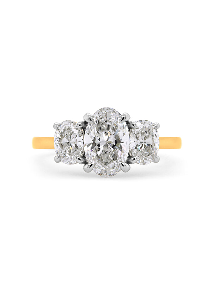This stunning lab-grown oval diamond trilogy ring in 18 carat yellow and white gold features a brilliant 1.51 carat center stone with two additional 1.00ct diamonds. A perfect symbol of love and elegance.