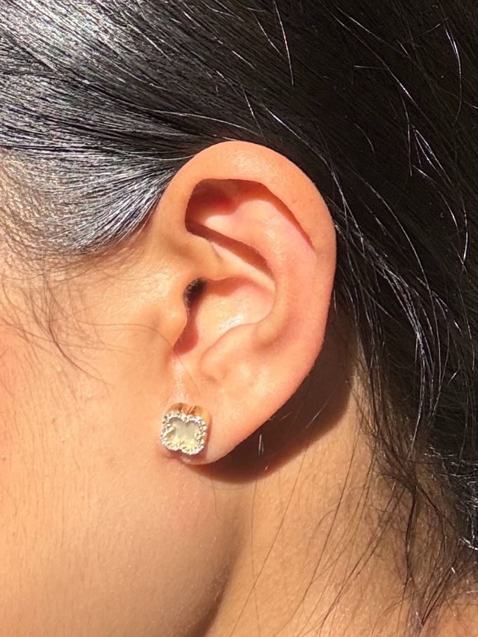 Elevate your style with our 9 Carat Yellow Gold four-leaf clover earrings, featuring lustrous mother of pearl centers surrounded by sparkling cubic zirconia. These beautifully crafted earrings blend timeless elegance with a touch of glamour, perfect for any occasion.