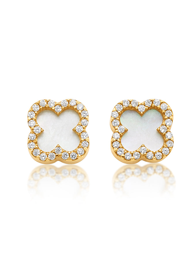 Mother Of Pearl & CZ Clover Earrings, 9 Carat Yellow Gold