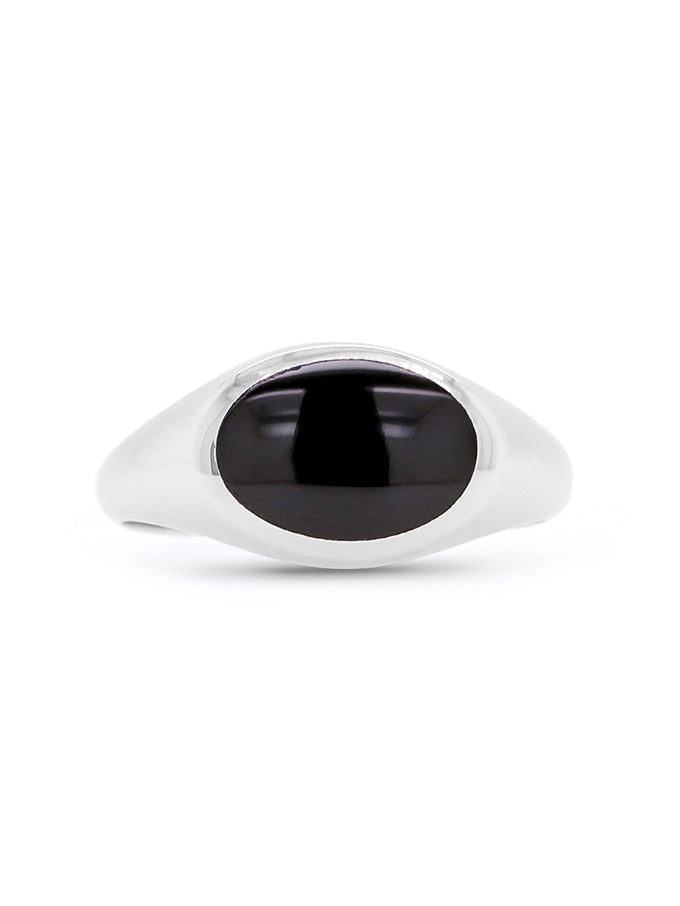 Discover the sleek sophistication of this Oval Onyx Cabochon Ring. The smooth, glossy onyx stone is elegantly set within a polished silver band, creating a bold yet refined statement piece. Ideal for adding a touch of understated elegance to any outfit, this ring complements both casual and formal looks with ease.