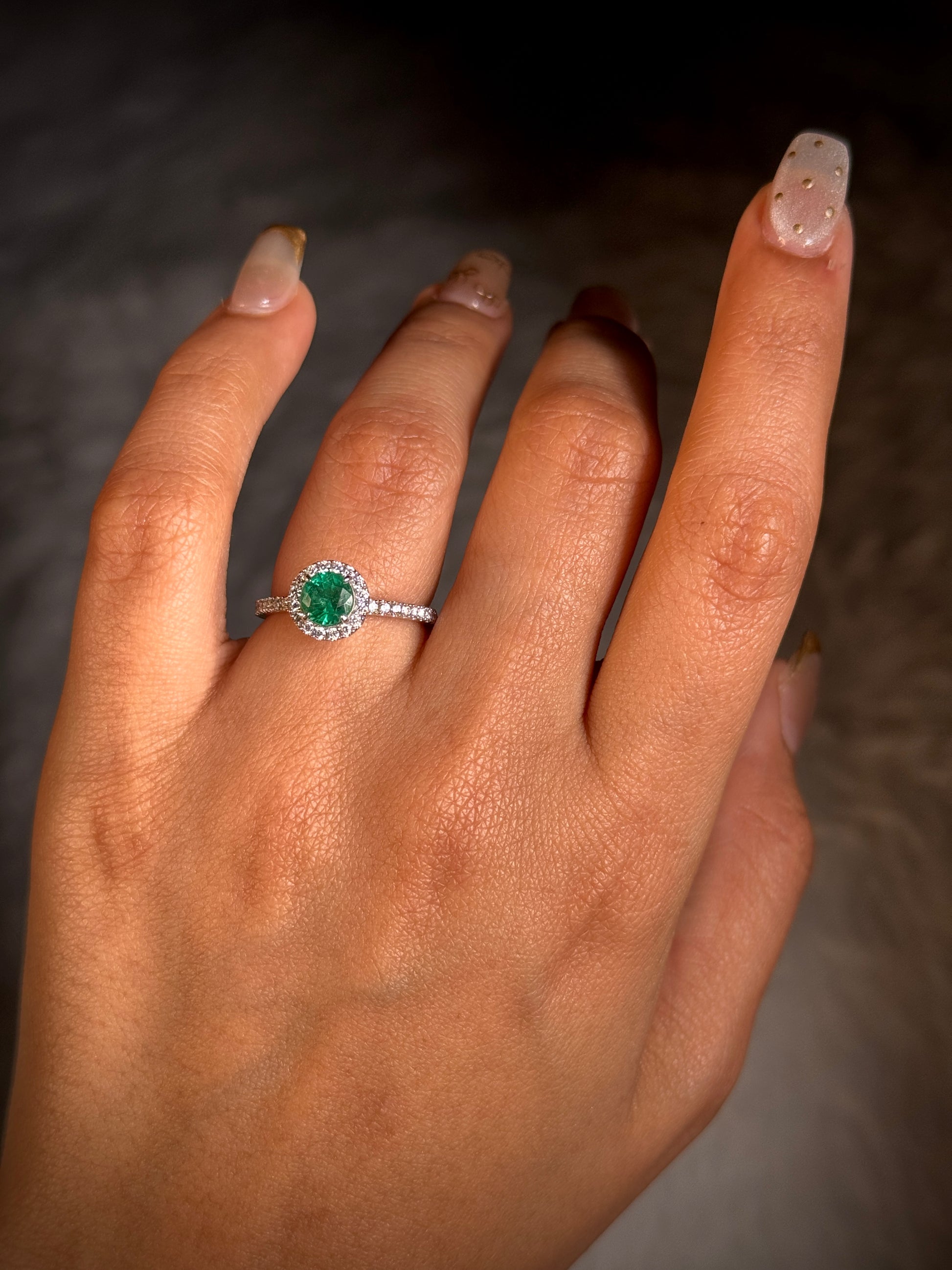 Round Halo Cluster Emerald Ring Set In 18K White Gold