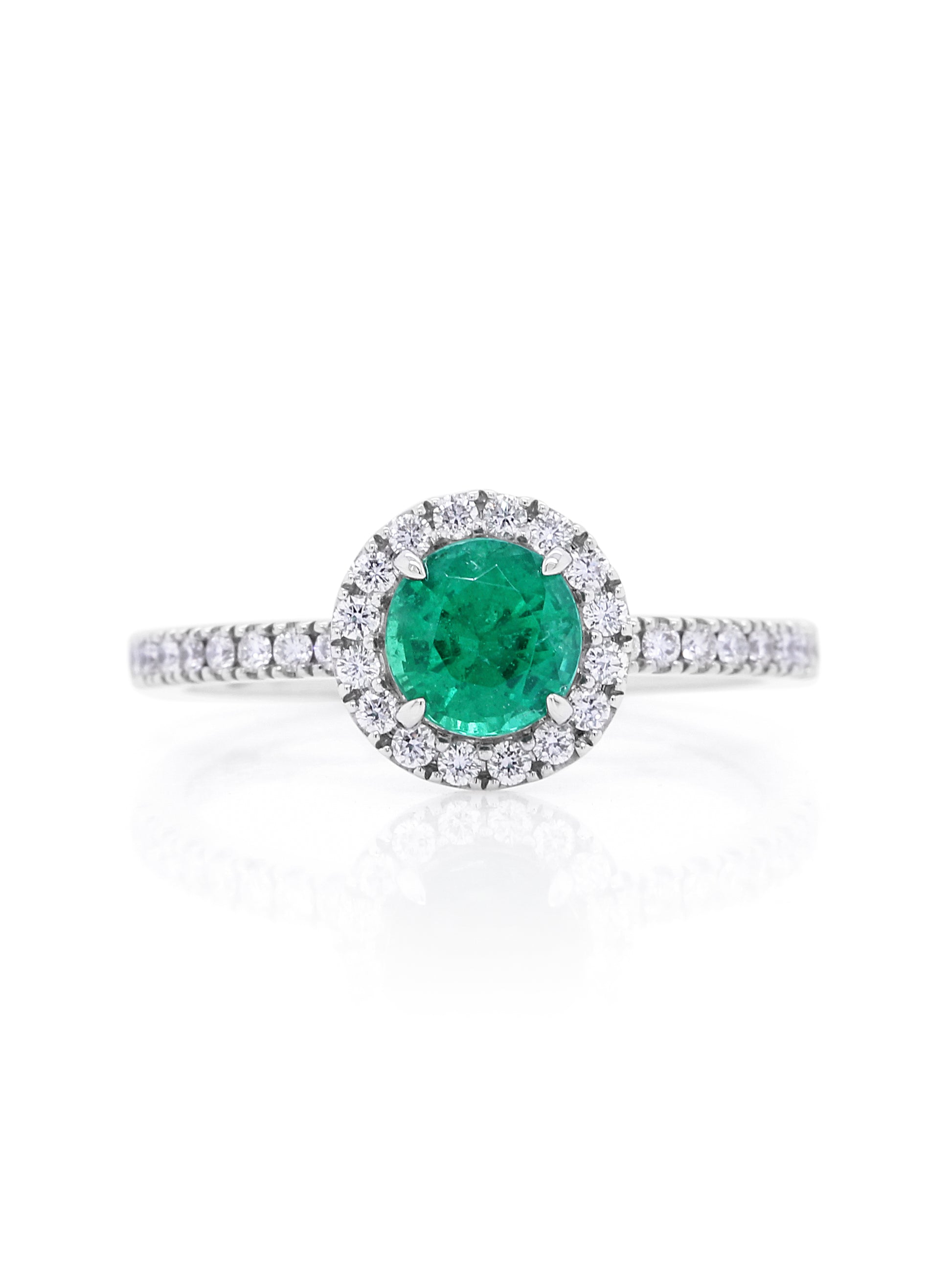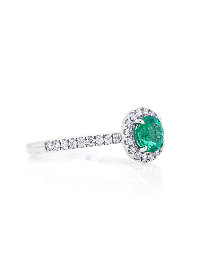 This stunning round halo cluster emerald ring set in 18 carat white gold features a vibrant 6mm round emerald. It is surrounded by a halo of 34 sparkling diamonds with H colour and SI clarity totaling 0.33 carats, creating a breathtaking and elegant design.