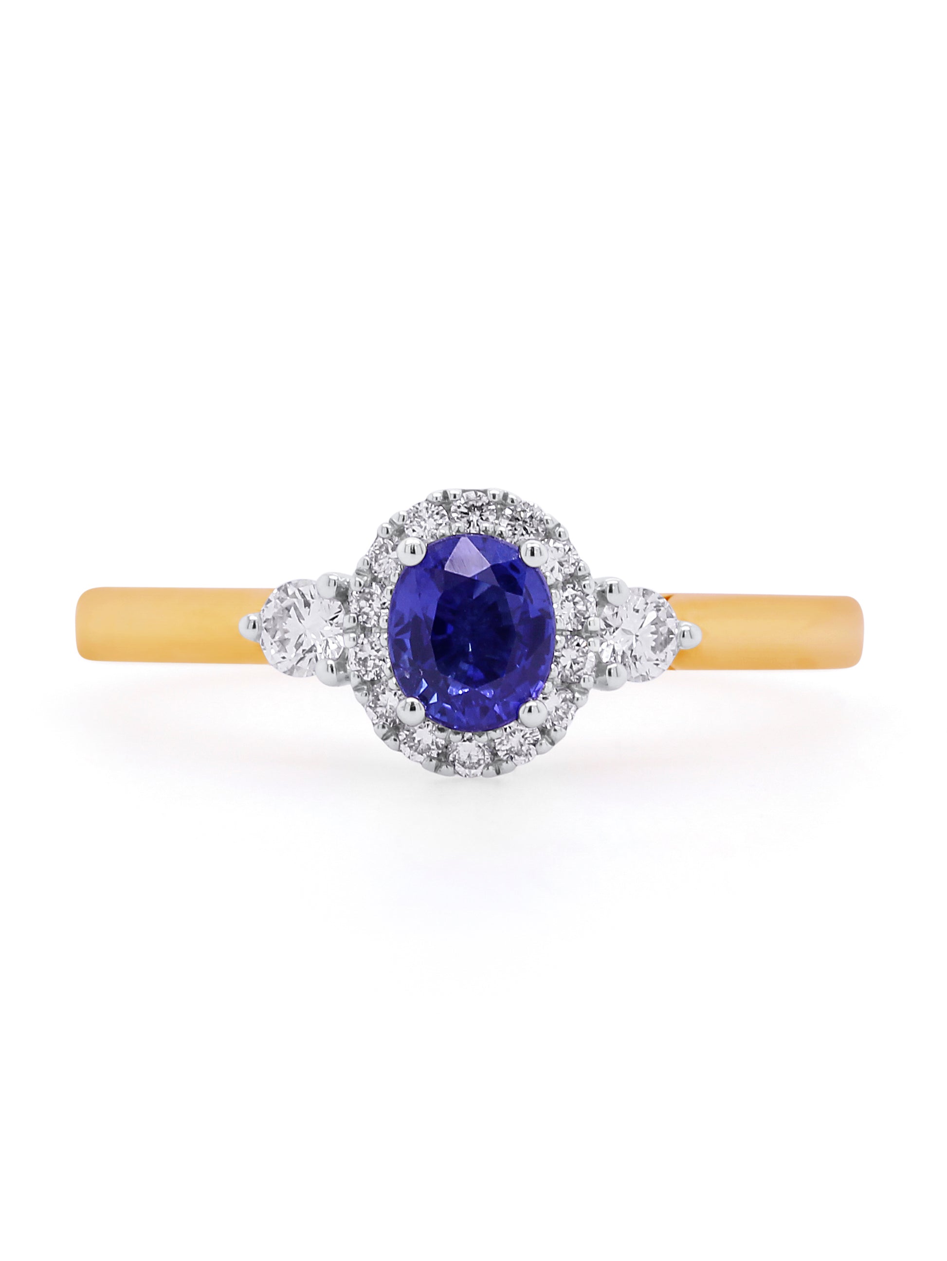 Timeless and elegant, this sapphire and diamond cluster ring is a stunning addition to any jewellery collection. Crafted in 9 carat yellow gold, it features a 5x4mm sapphire, surrounded by a shimmering halo of lab-grown diamonds totaling 0.21 carat with D color and VS clarity. A perfect choice for any occasion.