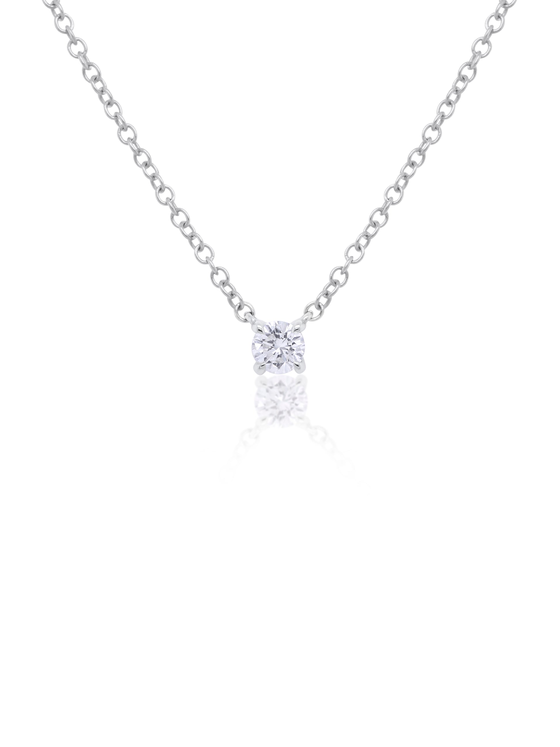 This classic solitaire pendant in 9-carat white gold features a 0.15-carat round brilliant cut diamond, claw set to enhance its brilliance. Suspended from an 42-45cm chain, this pendant adds timeless elegance to any ensemble.