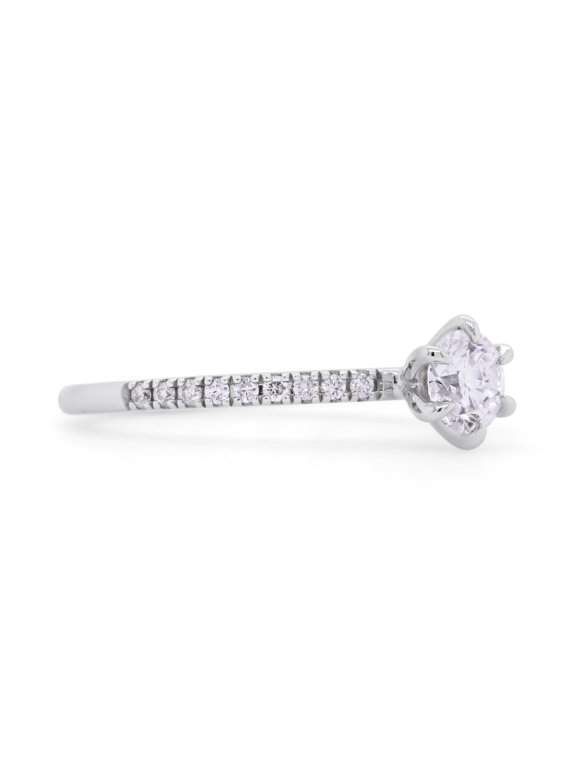 A timeless 18 carat white gold engagement ring featuring a 0.50 carat round brilliant cut diamond (D colour, SI2 clarity, GIA certified) with 18 accent diamonds for added sparkle.
